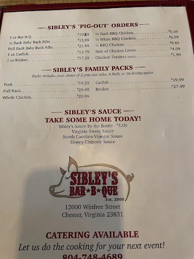 Read moreI had my sister in law up from North Carolina to see me after my surgery. She wanted some BBQ. In the Richmond area there is fierce competition. We decided on Sibley's because we would pass it going home RT 10 to Prince George. I wanted to eat inside but the chairs did not have cushions and since I had fusion surgery I needed to have the extra support.