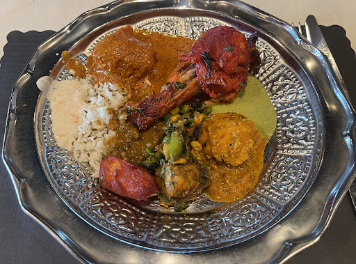 Even in an Indian restaurant I have seldom taken so long considering the menu before placing an order. The choices are all splendid: hunger finally forced us to our decisionsāLamb Rogan Josh for me, and the Seafood Shaadi platter for Chris. Incautiously we also ordered appetizers, as the rarely-found Lamb Samosas and a remarkable wrap, Gyro Roll, nearly filled us both before the main dishes arrived, huge and sizzling, to the table! Basmati rice is served with the dishes, and it is characteristically fluffy and aromatic; but in addition virtually every sort of naan is available for an additional charge.