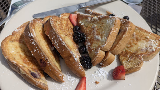 For breakfast the next morning, the hostess was MIA so a random person from the lodge's staff seated us. It took over ten minutes to get waited on and another 25 minutes for coffee and water to be delivered to the table. The coffee was full of grounds (as was the refill!) and only half full. I had to go ask someone for cream and sugar and then go ask for butter and syrup for pancakes and French toast. Both dishes came out too cold to melt butter. I would not order French toast here again, as the bread was from a cheap loaf from the grocery store. The fruit on top was good with the exception of the overripe, mushy blueberries.