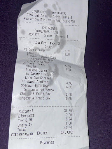 Did not have a good experience at this location. I came to this location on 8/8/2025 with my friend and her son from Virginia Beach, headed to DC. I placed an order at 11:32am which totaled $40.54. Cool. The young lady that took my order was very polite and nice. However, we either were forgotten about or just looked over. When we got in there it was about 4-5 other people waiting around. Cool, no problem. However as we’re waiting more people came in and seemed to get their items before we did. Yes, I took in account mobile orders, but no, these were people that ordered in line AFTER us. We ordered 3 drinks and a wrap. Nothing 2 difficult, however one after the other, people were receiving their items before us. I clearly thought, just like with many other establishments, it’s a first come first serve experience but than again maybe getting 2 caramel Frappuccinos and a tall vanilla bean was too much at one time. After 20 mins, we finally received our drinks after the young lady who took our order asked the guy making the drinks if he needed help and I believe told him we ordered before the family of 5 that came behind us who he had served. All in all, if you need help just say so and be mindful that people are paying for a service, not to be pushed to the side for...