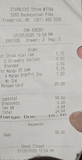 This evening, my husband went inside a Starbucks and asked for a Venti Strawberry Lemonade Blended for me (what he ordered for himself was fine) After we started down the road, I took a sip of my drink: I knew something was wrong! I checked my receipt: it said Venti Strawberry Acai Lemonade (I tried this before, didn't like it, and stayed with the Strawberry Lemonade Blended) It was too late to hunt down a Starbucks that was still open, or we'd go in and get the order made right. Then I noticed something I hadn't noticed before: on my Starbucks app, for the last several purchases, when my husband asked for and brought me Strawberry Lemonade Blended, the app has been recording Strawberry Acai Lemonade (probably why this Starbucks mistakenly gave me the wrong drink and CHARGED me for the wrong drink even though my husband asked for the right one, and until this instance, always brought me the drink I wanted! I will be contacting Starbucks Corporate office about this in am, esp. since I was charged for something different than what I received ( I have last 2 sales receipts showing this, see below), just in case I was charged more than I was supposed to be, for the drink I received.( I'll be asking Starbucks Corporate to look back in their records, for earlier...