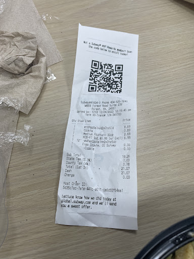 Read moreHorrible staffing, Lynchburg has poor customer service in general, but they redefine the definition of bad customer service here. It hard to order when every time they ask you a question about the food they seem genuinely angry at you and like you’re a burden. I know no one wants to work in customer service and it can be extremely taxing and exhausting to work in the food industry. But there is zero effort to make a positive impression here, fake or genuine. There is however, a strong effort to make you feel unwelcome and uncomfortable throughout the whole experience. Unfortunately this is the best subway in town as far as food goes, but everything else about this...