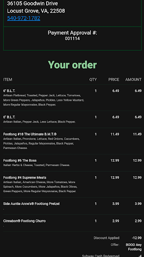 Read moreOrdered online, set option for curbside but I didn’t have a signal so I just walked in. Ordered two subs and they didn’t have any bread other than whole wheat left by the time they went to make the second sandwich so I had to wait on the second sub to be made. Wanted extra jalapeños and banana peppers and they made sure I had plenty.
