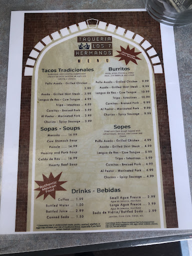 DO NOT let what you see on the outside sway your decision to eat here. Yes, it's attached to a gas station, and yes, it's just a concrete cinderblock building, but when I tell you that I ate absolutely the best, and I do mean THE BEST (and AUTHENTIC) Mexican food I have ever ate (and that even includes the food I ate while vacationing in Mexico several years ago), I'm not lying or just saying that. My family goes to our local Mexican place so often that the waiters there know us and our usual orders by memory. We love Mexican food. My son and I had travelled to Winchester for an appointment, and decided to stop at Taqueria Los 7 Hermanos for an early dinner before heading back home a few hours away. At first, when we pulled in, yes, we were a bit hesitant, but thank goodness we decided to go on inside. The inside was bright and colorful, the tablecloths were embroidered with beautiful Talavera-like designs (I happen to love Mexican pottery). We both ordered the Al Pastor tacos (3 each) and some guacamole and chips, my son got a Jarito and I got the Mango Agua Fresca, and after finishing those we got another Jarito (Guava - which we hadn't seen before) and a Pineapple Cucumber Agua Fresca. The chips and guac came out shortly and you could tell this was not your standard store bought, jarred guac, this was hand made and absolutely the freshest guac you could possibly get; the chips nicely salted and warm. Next, our tacos came out ... hand pressed tortillas, juicy marinated pork, some cilantro, a little bit of red onion... along with a little bit of salsa verde and salsa roja on the side .... wow, we kept commenting the whole time we ate about how delicious all of it was and it didn't stop there, we talked about how fantastic the food was all the way home.