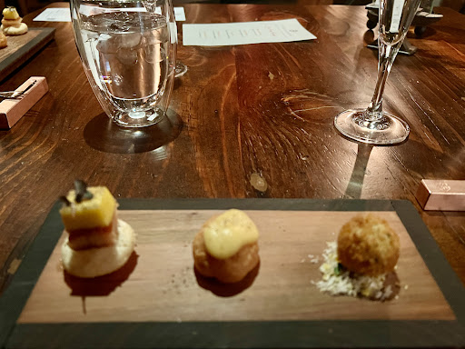 We had the absolute pleasure of dining at 3 Blacksmiths last week. It was the best meal I have eaten, both in taste and presentation, with the added huge bonus of meeting all the staff and the owners over the course of the evening. The personal attention to diners makes you feel you are at a dinner party (where unfortunately the hosts can't sit down but are totally attentive and charming). There are six or seven tables (depending on group sizes) and one seating, ample candlelight in a charming dining room with plenty of space between tables. Sara, one of the owners, had reached out ahead of time to see if there were any celebrations or dietary restrictions. We were greeted by a happy anniversary note and then a card at the end of dinner. Over the evening there were a few more surprise courses than listed on the menu (photographed below). I missed taking pictures of multiple courses because I was so excited to dive in! Every bite was truly delicious, and all the combinations were so well matched and provided little surprises of texture or taste as well as beauty. We both opted for the zero proof pairing as we had never done that before and I would more than happily forgo wine and do that again--the "mocktails" were perfectly matched to the course. For example the meyer lemon and thyme "Meyer Lemon Drop" was the perfect pairing for the scallop crudo course. Each drink perfectly complemented and brought another level of interest to the food itself and I can't imagine wine being able to do it so well. Given a choice, it brought more to the meal than a wine pairing, however delightful (and other guests having the wine pairing seemed very delighted!). We savored each bite and ate slowly, the entire experience of the meal was more than 3 hours, we enjoyed watching the staff prepare and assemble the courses with the open kitchen (remarkably quiet). The "amuses bouche" trio was mackerel and a gourgere and a stuffed arancini —all so good, all different but complimentary!). The Scallops were magical looking and divine tasting. The black kale and beans were warming and delicious, we had two kinds of bread (focaccia and rye sesame pecan (divine) and two delectable kinds of butter, a salted one and a butter with persimmon. The ravioli were delicate and divine and the frisee greens added a gentle bite and contrast. The Pekin duck was the best duck I have tasted. The meat tender and flavorful and moist and the fat perfectly cooked and full of smoky flavor. The Mont Blanc dessert was delightful. It looks like a ski slope of meringue (browned with a torch) then a meringue bowl for the chestnut filling with candied nuts. A candied violet added a touch of color. Perfect finish to our dinner (also with a wonderful cardamon thai tea mocktail). I was inspired to want to learn more about making zero proof pairings myself when I cook for company! We can't wait to go back! The staff were delightful as I said and I was chatting with Sara about cookbooks and she not only brought one out for me to see but followed up the next day with favorite cookbooks of all the staff. What a wonderful personal and sincere touch. Reservations are pretty full 200 days out but we found a table available 3 weeks out and they have a cancellation list. I can't recommend 3 Blacksmiths highly enough. I truly can't wait to return. The combination of food, drink and hospitality has never...