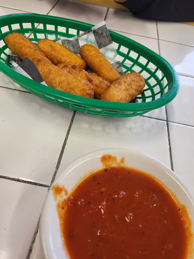 We ordered mozzarella sticks and pizza: half pepperoni half cheese. We were very satisfied with the food. The mozzarella stick came out freshly made & hot. They were crunchy with a side of simple mariana. The pizza was a little greasy but stayed crunchy the entire time. Nicely cooked, not burnt or doughy. Good flavor with sweet sauce and seasoned cheesed. Again, food came out freshly made and hot. The crust was light and crunchy. The pizza reminded us of NY pizza.