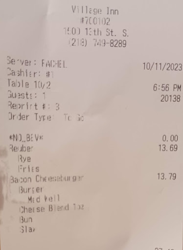 Ordered take-out online, we have a few meals from area restaurants each week to support them and realized we hadn’t patronized the Village Inn. This review is for their takeout, as we have been usually happy with their service and food in house. We ordered the pot roast and the Friday fish fry, and two slices of pie. Found there was only one slice of pie and had paid for two. Nothing had been said upon pick-up. Wife had to go back in and ask about the missing pie and was told they were sold out, sorry. She had to ask if maybe they could refund it or maybe offer a different one, yeah...