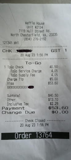 ย ย ย Read moreMy husband and I went to the new W. H. on ironbridge rd. The service was nice but the cook was lousy, our hash browns were like burnt potato chips. Later in the week we tried the one on midlothian across the street from wawa, the cook was good but the server was lousy, we had to ask for condiments repeatedly, then we ask the cook for them, the server was entertaining a group of guys which I didn't see pay for their meals, when they finished their meals the cook and server left to go out into the parking lot with them, leaving us in the restaurant alone approx 30 minutes, the phone was constantly ringing, the server came in at the end of our meal to collect the money, So we tried the W. H on hull street right before the school, the cook and server were excellent, we tipped the cook and server, and we were discussing that waffle house was the best one then all of a sudden my husband was hit in the back with a waffle, one of the servers was throwing it to our server to trash it, as he threw it to her I guess the wind curved it., well I guess we will keep trying until we find a...