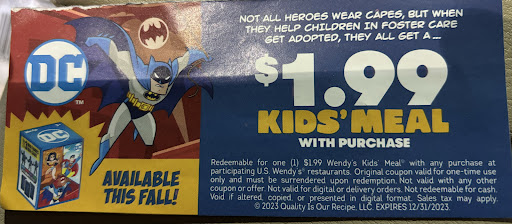 Read moreWow! I'm speechless with this one guys. I tried to use the $1.99 kids meal coupon that comes with the boo books and the lady at the drive thru window (older Spanish lady, I believe she was the manager) refused to take the coupon! She said it's not a coupon and just the cover of the boo book. I asked her to read the coupon and she refused, so I read it out for her. She refused to listen and just kept yelling "No no no it's not a coupon!" I tried to read it multiple times and she just kept talking over me. I then told her then why is it the other Wendy's accept it? I've used it at three other Wendy's. She just kept repeating the same thing. This was Tues, 10/24, around 10pm. To the owner of the store, please hire competent employees with better attitudes! Unless you want to continue to...
