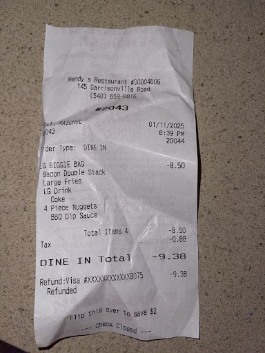 Read moreJust ridiculous the endless stuff at this store!!!! From consistent wrong orders, fixing these orders with no gloves or hair nets, not too mention clear visible skin rashes or bed bug bites and the arms of these employees and managers eating fries out of customers bags and the fry pan with no gloves like it’s ok witnessed by my daughter and I and now the pointless QR scan for rewards on your app not being honored because I didn’t explain what the QR scan code was for for them to manually put it in explained to my after I made my purchase which now I have to wait 2-3 business days to be refunded to my account. The pictures below is the gentleman with the rash or bites on his arm all up and down his arm and the African American with glasses and short Afro cut woman thats a manager (standing with her back turned) who likes to eat fries from customers bags and the fry pan which was the food of customers I door dashed to. Also pictures of my purchase tonight which is the same woman who messed up my baconator order a few weeks ago only to get home and learn I was given a disgusting mushroom burger. TRUST ME THIS IS MY LAST TIME COMING THERE AND I HOPE THISE READING THIS MAKE THE SAME DECISION. I shouldn’t have waited this long but I like Wendy’s and don’t want to drive to rt. 3 to get it and hey I try to give yall a chance but you all fail...
