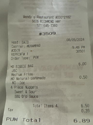 Read moreI have been ordering the same order for almost 2 months for me and my husband. On 9 AUG 24 Female older manager & staff gave my husband old stale fries and nuggets, wrong/no drink, wrong size (wanted the large supersized), cold shrink up pretty nasty taste fries, no ketchup, napkins, wrong sauce cold bag. I sent him back & they gave back/served him the same old stale food you shouldn’t have sitting there for so long !! You didn’t have a line of cars in the drive-thru and the right thing to do was to recook the food fresh, especially since my husband had to make a second trip because the food was old and stale. Even if the workers were new, the shift manager on duty should have instructed them to recook the food to ensure that it was hot. This had to be the most horribly prepared food I’ve ever had from this restaurant. To waste gas and you only repeated the same process with the same old food is unacceptable. I went back the following day 10 AUG 24 & the young manager start discussing about prices when I only came for my refund. On top of that she didn’t know what she was talking about when it came to the menu, which is terrible for a manager who preferred to engage in a no good and incorrect reason to discuss & act like she want to embarrass me when I was talking to her now and in a respectful manner so no one could even hear other than her. Her attitude was so bad she did not even offer to cook the meal after I gave her store credit in my explanation that they usually serve hot fresh food, except the nuggets. Maybe it is time to just leave Wendy’s alone. I just got transfer from work to the DC area and looking for a place to live, & if I am going to eat and pay for unhealthy food it needs it needs to be what I paid for without coming back twice or drama or not extremely substandard & bad attitude coming from the managers & workers. I can see why the 1 star reviews are double or triple the 5 stars. All you need to do is served what the customer is paying for and treat people with the professional dignity & respect...