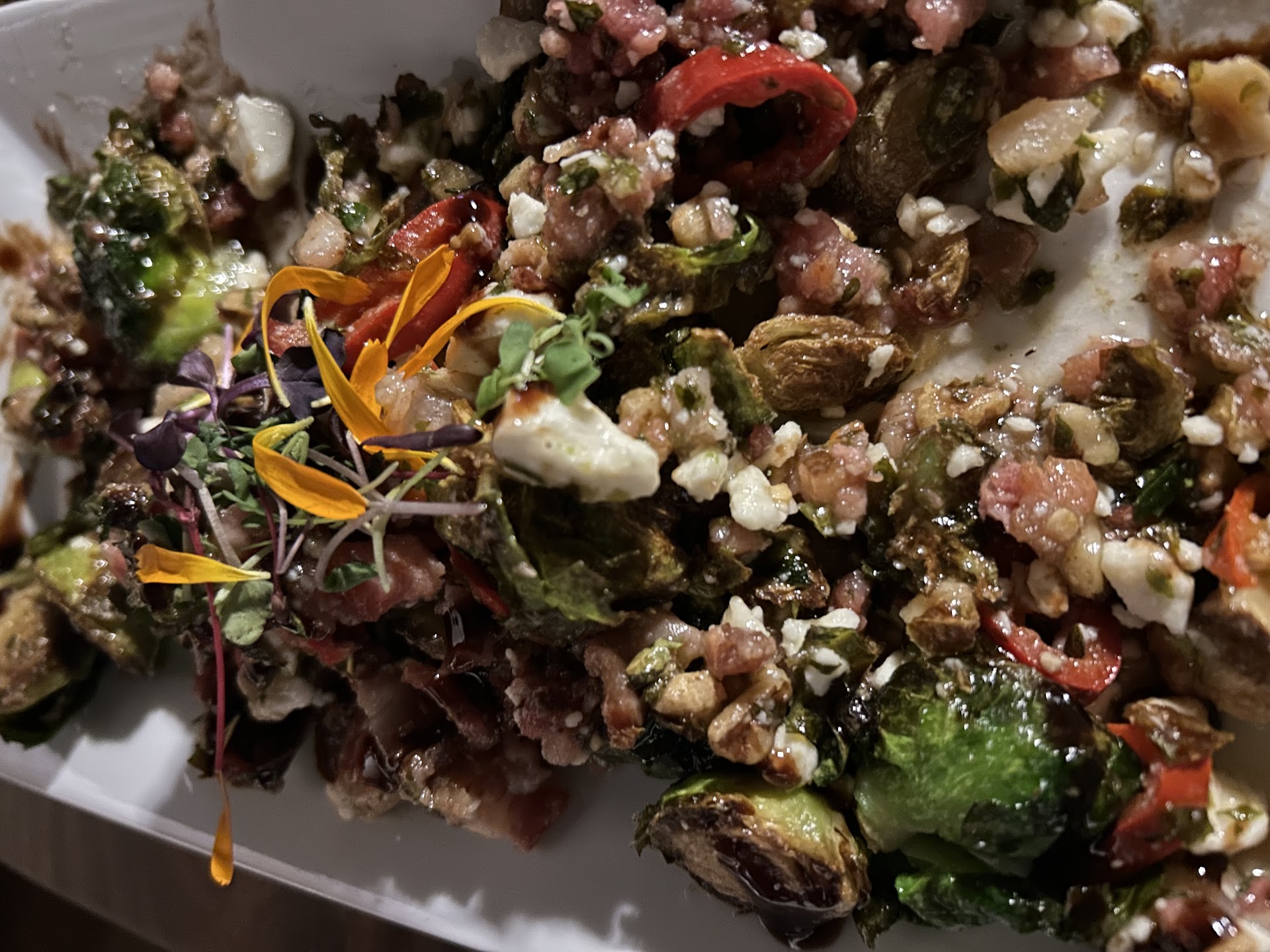 Read moreOkay, so this has moved up to #1 as our favorite spot for dinner! It was our first time and we had no idea the treat we were in for when we entered the 2 story beauty. BRAVO, Bravo Farms! This restaurant is gorgeous with a chill yet classy vibe. We headed straight upstairs and got a table that overlooked the first floor. The lights were dim (perfect for a Tuesday night) and we were greeted by Kaylissa with a smile. We bombarded her with a few questions about beer choices and dipping sauces and she didn’t miss a beat, taking her time to inform us what the options are. -Appetizer: Candied Brussel Sprouts 5/5! If only all brussel sprouts could be this scrumptious. I think there was a feta cheese in them and some red bell pepper? We didn’t care, we ate them and will 100% order them again. -Meal #1: Tri tip nachos: 3.5/5. They were good, but next time we’d ask for some jalapeños or something to make them spicier. We tried a sweet and spicy sauce, but that didn’t go well with the nachos. They were LOADED. Two people can easily share these and still have some leftover. Meal #2: Bravo Philly w/chicken: 5/5. Delicious! It’s gonna be hard to order something different next time. This melted in my mouth and I dipped it in the chipotle sauce. I was so full after feasting on the other plates, but finished this bad boy. So good! -Sweet Potato Fries: 5/5. Bomb! Just how they should be- crunchy on the outside and soft on the inside. -Kaylissa: 6/5! Good service is hard to come by these days. I don’t think we expect much, but it’s just so nice when a server is friendly, pleasant, attentive, and just makes you feel at home for a short time. So, thank you, Kaylissa.