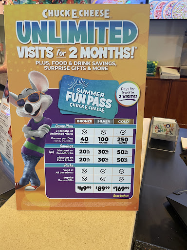 Ā Ā Ā Read moreThis is a very difficult place to rate due to adults rating and kids not being able to rate š. Overall I would give 3.5 stars, but no half star available. There was 3 parties going on (set up available for 5, but would be way overcrowded), and the kids were having a great time š. As per other recent reviews, the structure to get prizes for the kids (especially 8 and under) really needs to be adjusted as far to many tickets are required for anything worth getting š¤£š¤£. But again, the kids had a great time interacting with "Chuck E Cheese" mascot and staff! Plenty of games, play area, trampolines and they really enjoyed the money/ticket grab in the air machine, hahaha š . The only downside is the food is pretty bad (pizza) for the price,saw alot of adults buying the salad bar. Thinking Chuck E Cheese could do a group special on the salad bar and forego the pizza!? š¤. Again, overall it was a good option and the kids were having a blast šš. For a almost no mess, clean up and allowed to bring your own desert and party items I definitely recommend the experience šš. Only other mentionable is the first group of parties were from 10am-12pm and Chuck E Cheese didn't open until 10am, so a little time was lost waiting for the swipe cards, party setup and ordering of food (would be better if they could open about 15 minutes earlier). Thanks...