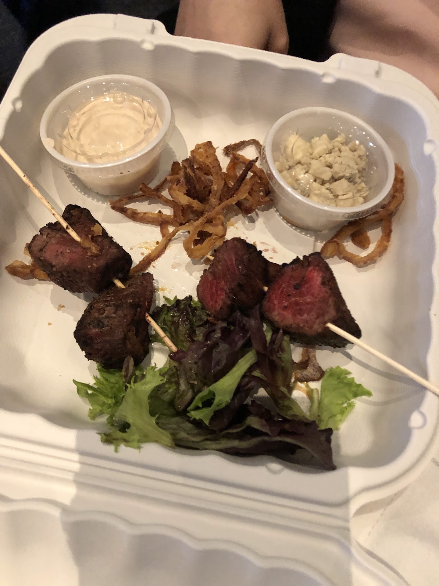 they lost a star for how well it was cooked. i ordered steak medium and what i got was well done and charred. it also said it had mushrooms on it... i literally saw a small sliver of a mushroom.. thats right 1 sliver.