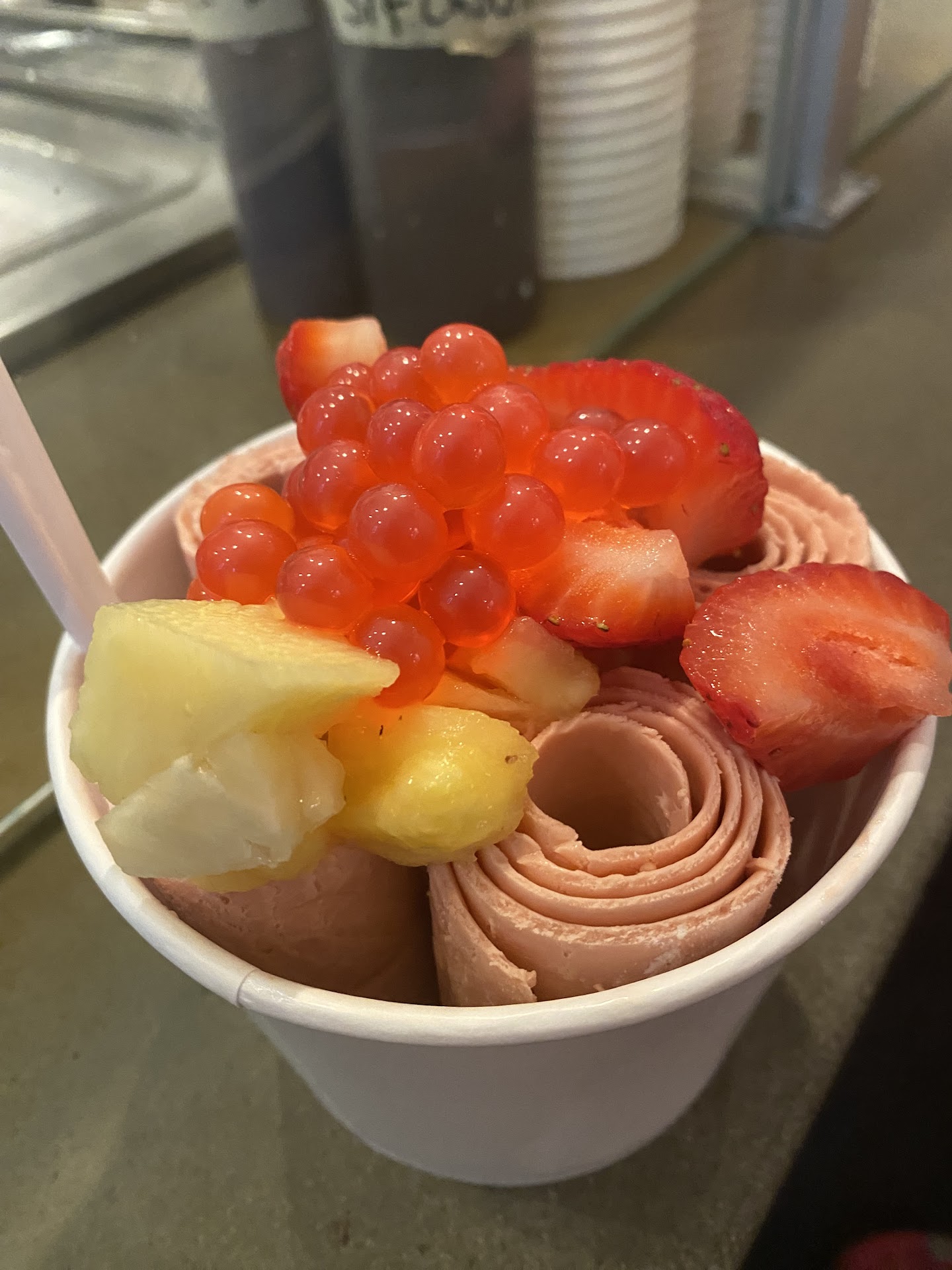 Well, when you actually get your turn to watch your ice cream get "rolled", its an OK show, if you can call it that. They roll your ice cream and then place it in the cup. They add your toppings and whatever goodies you asked for. The presentation of the ice cream is cool. The ice cream itself, falls short and does not really have an real flavor to it. We got the "Strawberry Fields Rollover" (love the Beatles) which had little to no flavor of strawberry. It was flavorless to say the least.