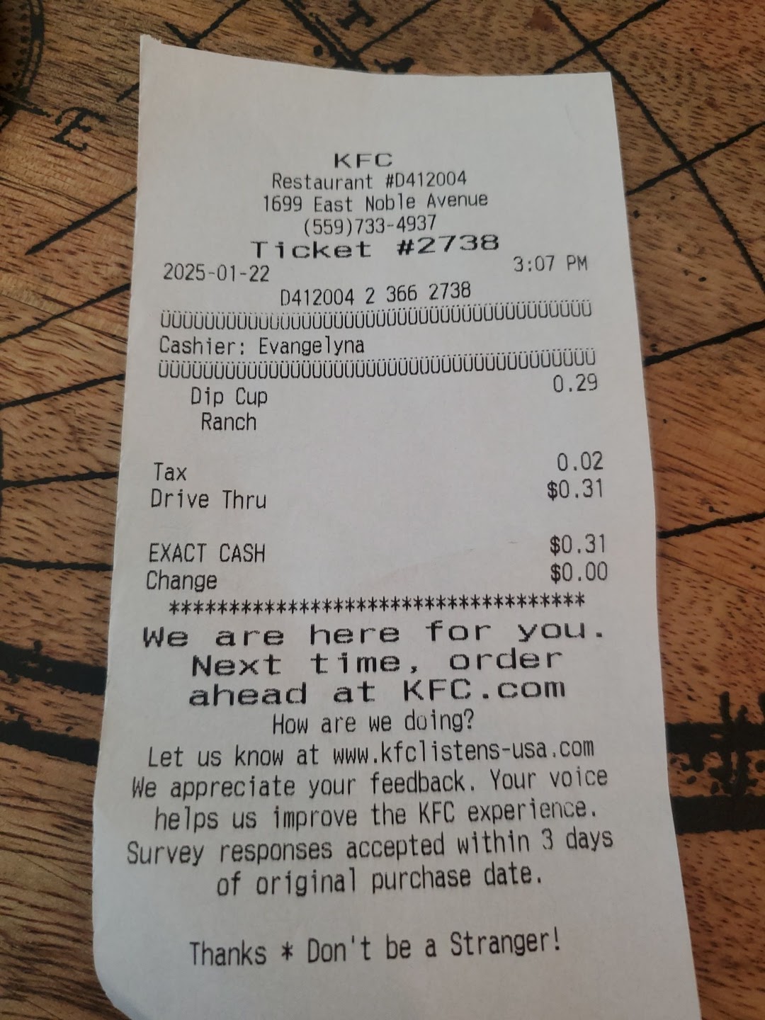 I've been going to this KFC for years and the food is pretty decent never had an issue. However, the customer service is something else, now looking at the reviews about customer service I won't be back. I pulled in to the drive thru and asked what the specials were. The girl working the drive thru was rude and hard of hearing. I had to tell her a few times that I couldn't hear her she never spoke up louder. I can tell she was doing it on purpose. At the drive thru window she was being very short and rude. I noticed what I ordered came with dipping sauce and she never asked if I wanted any. I asked her what kind do you have? She rolled her eyes and told me what they had super fast to be difficult. I told her I'd like another ranch she said it was 31 cents. So I gave her exact change. She couldn't count the change and was at the register for a bit. She gave me the ranch and 2 dimes back. She can't count money. She makes 20 an hour with inept customer service and can't do basic arithmetic. If you don't like your job or lack customer service (which is paramount) for a business to function then quit...