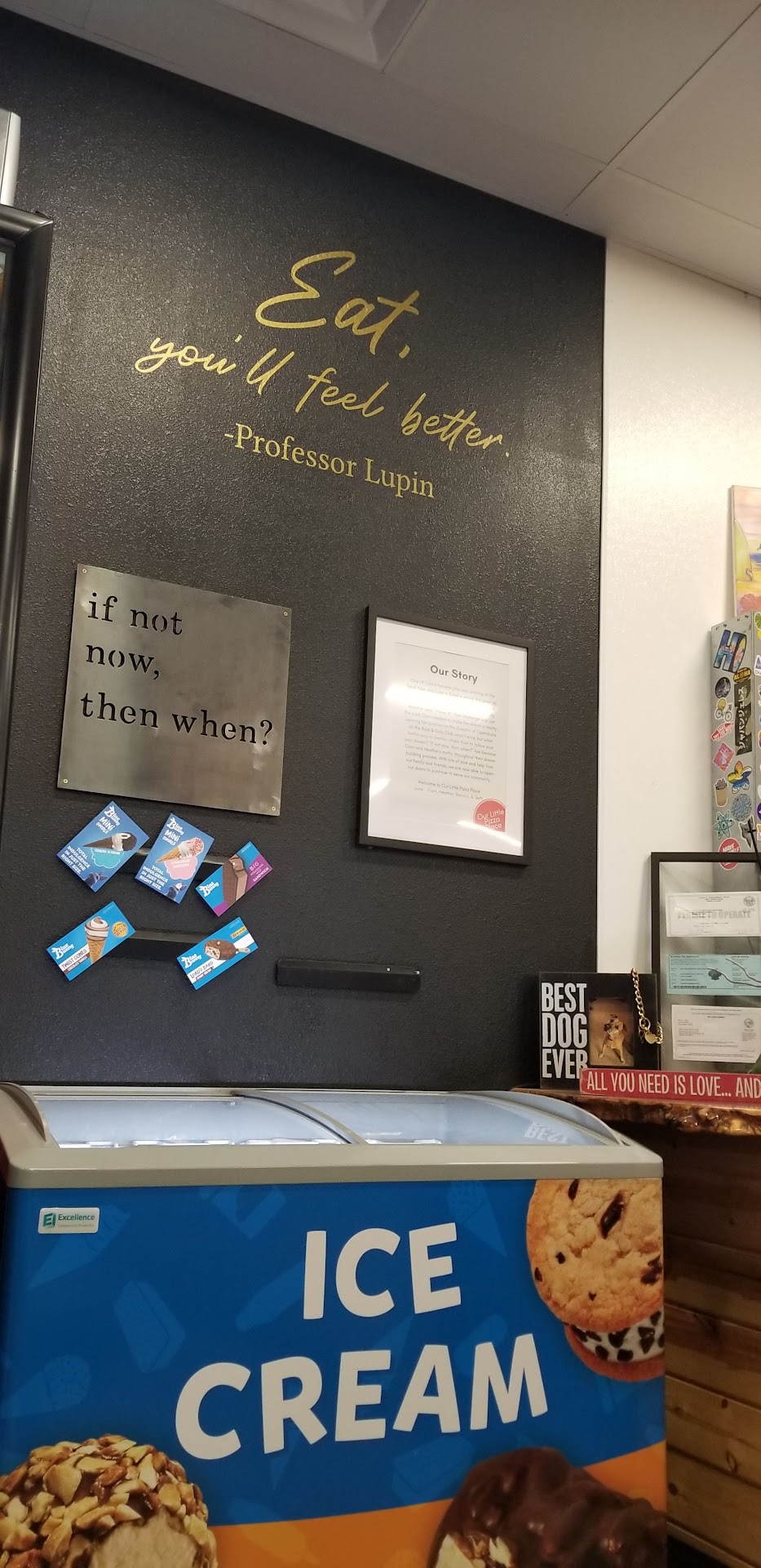 If you're not a pizza fan, that's perfectly okay - they're also able to prepare salads and sandwiches. But whatever it is you like to eat, don't let it stop you from coming to this new local hero - and maybe even purchase one of their pieces of merchandise while they work...