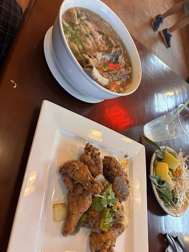The atmosphere there was nice and i loved the ambiance! however me and my boyfriend were a little disappointed with the service. they were very busy so i want to give them some grace.. we got there and were seated immediately and they took our order right away. we both got sodas and they were both very flat and we felt bad saying anything but we ended up just asking for waters instead. i order pho and my boyfriend got a banh mi. i got my pho and we had waited 10 minutes before i finallt decided to ask for my boyfriends banh mi. when we asked they said it was coming then came back a couple minutes later saying they didnt have bahn mis. they asked if we wanted something else and we asked for the menu again and a couple minutes to decide what we wanted instead and then they never came back and my boyfriend decided to just not get anything at all. when we paid my meal plus an appetizer was 40$. a bit pricey for only one person to eat. i know they just opened and i would love to come back and try their food again and hopefully their service will be a bit...