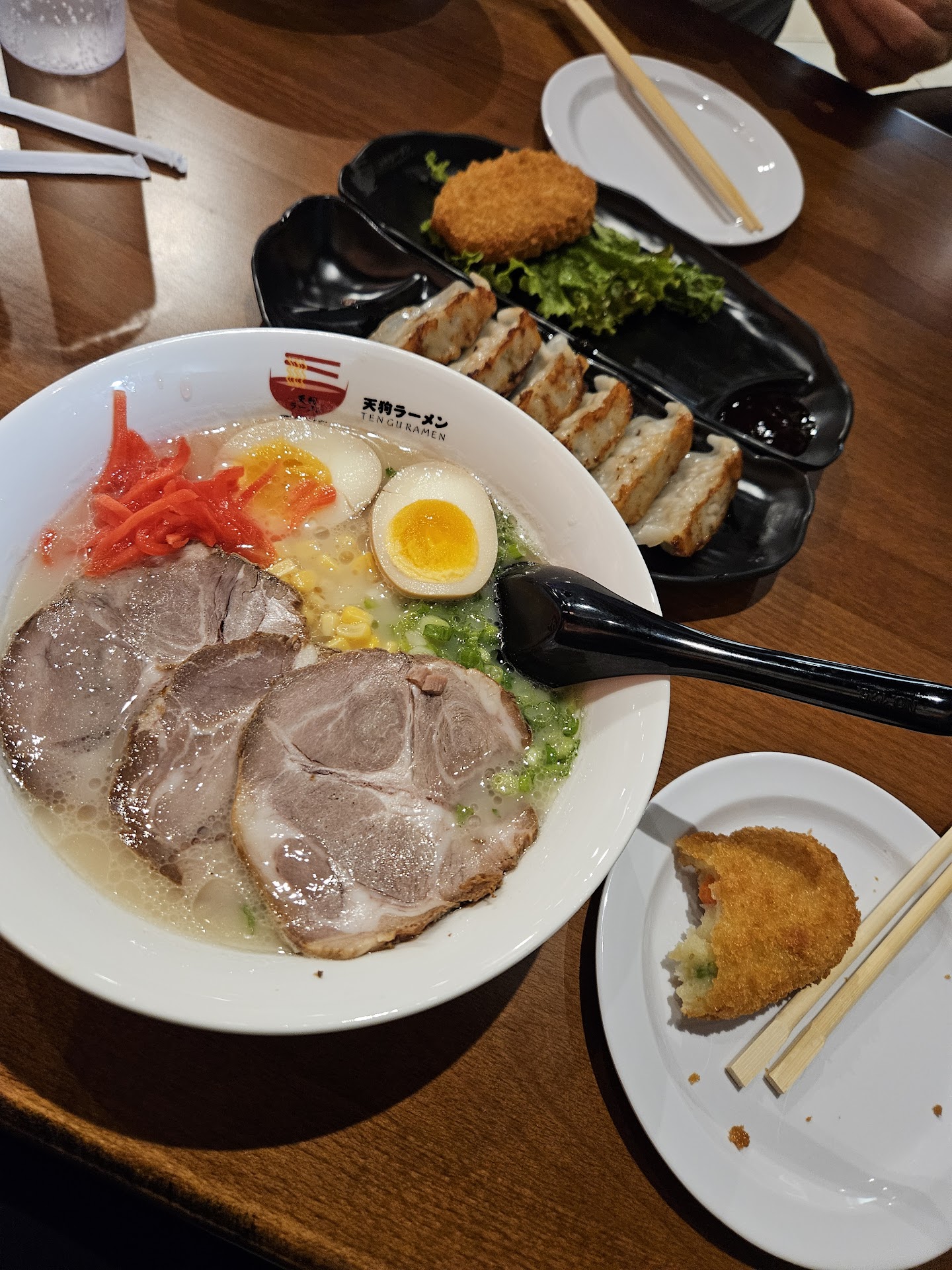 Read moreI was so excited to try Ten Gu! I ordered the Tonkotsu Ten Gu ramen, vegetable croquettes, pan-fried dumplings, and their chashu pork ramen, and everything was delicious. The atmosphere of the restaurant was really nice and they had cute decorations like paper umbrellas hanging from the ceiling. It is definitely a nice casual date spot or a place to get lunch/dinner with your friends. They had a good amount of options for ramen, udon, rice bowls, appetizers, and drinks (soft drinks and alcoholic). The prices were great compared to other restaurants in the area that sell ramen, and their taste was much better. Our food came out super quickly after we ordered and our waitress was very nice! The only issue I can really see them having in the future is that their entrance area is really small, so if people aren't seated right away, it will get crowded by the door very quickly. Overall, I had a great experience, and I'm super happy I won't have to drive to Fresno or further for a good bowl of ramen...