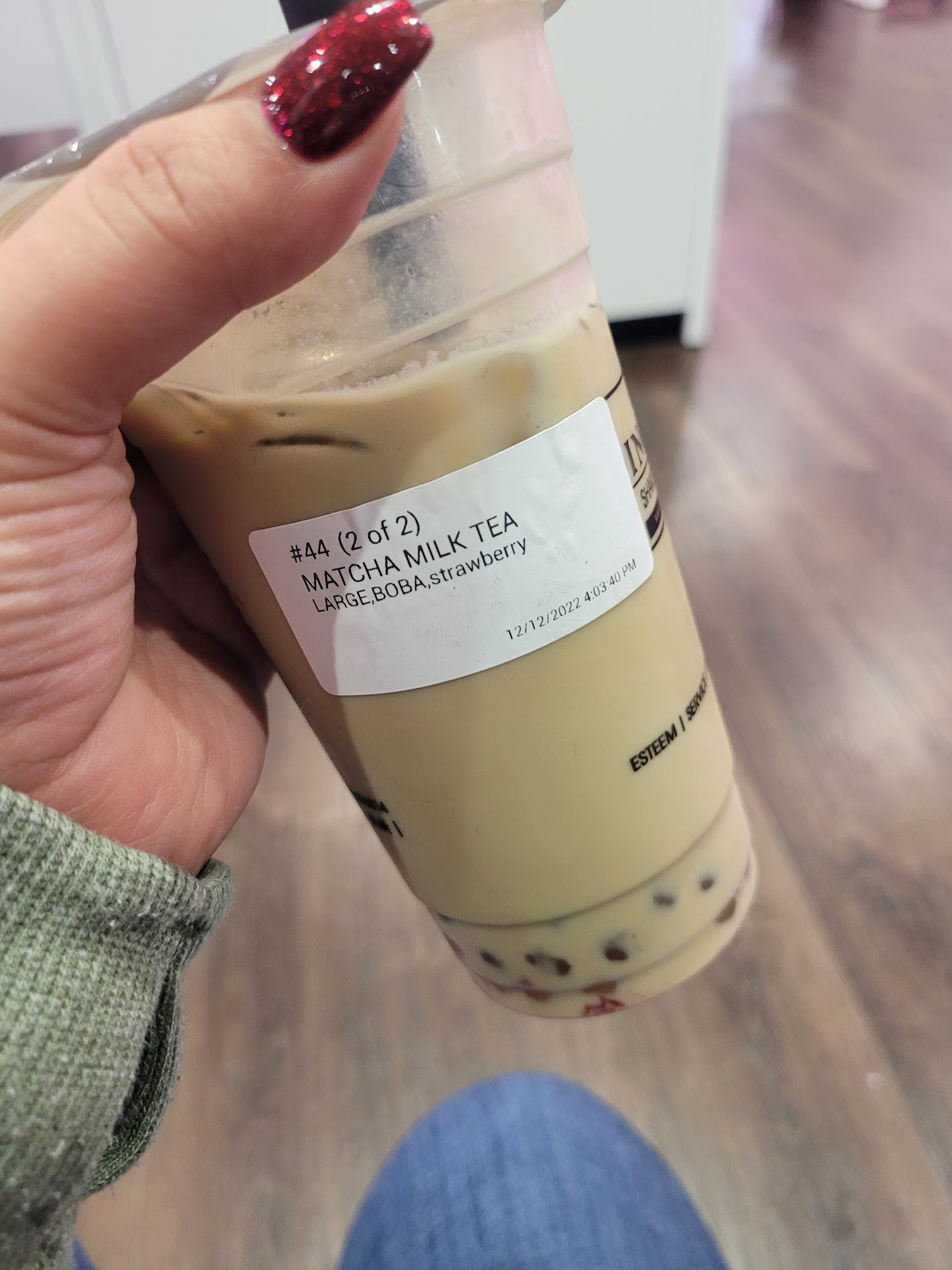 I purchased an Oolong Milk Tea with boba ("milk" is non dairy substitute on all drinks) and a custom drink, Match Strawberry Milk Tea with boba. The Oolong was perfect! And the Strawberry/matcha not too sweet in a good way! (Sometimes this mix can be very overpowering)
