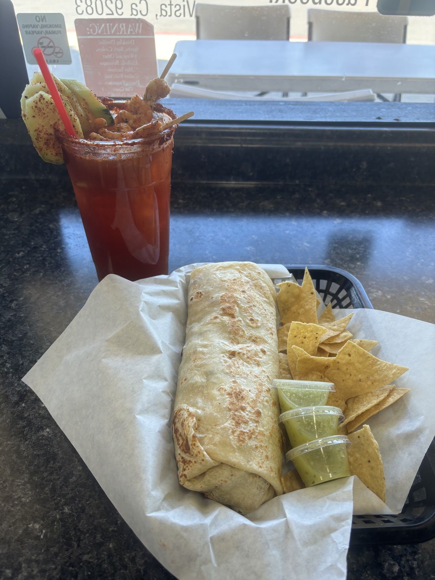 I ordered a machaca and ham burrito with guacamole and sour cream. As well as a separate machaca burrito for himself. I had been given a business card from a coworker, that had allowed me to get a free crispy taco, so I ordered one for my dad.