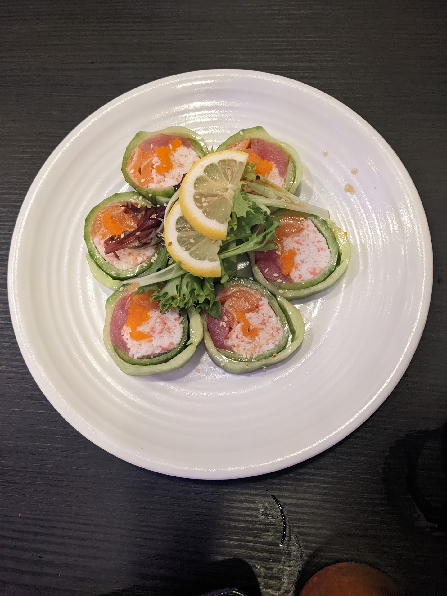 Now, onto the food. Options were very nice, something for everyone. My dinner date is a finicky eater, and every time I suggest sushi for dinner, queue the dramatics. LOL! But, my dinner date not only found SEVERAL options that were non sushi, but he actually had a tough time choosing! He landed on the pepper steak salad, and I had the lemon salmon roll. Our starters were garlic edamame and cucumber salad. A few flakes of sea salt would have gone a long way on the edamame. Cucumber salad was perfectly dressed and not overly vinegary. My roll was fresh and delicious. The steak salad was nicely seasoned and melt in your mouth tender.