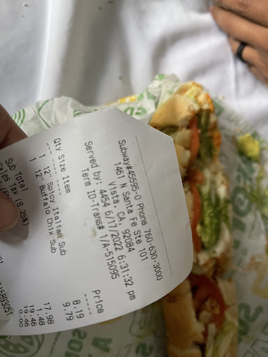Very disappointed on the service from this subway location. The young man working at the 1461 N. Santa Fe ave. Vista location on Sunday 1/20/2019 around 730 pm, late shift, was so disrespectful !! Rude and just didn't care. He charged me for some cheese garlic bread and got nothing but a burnt nasty sub I paid extra for something I didn't receive and not even close to what subway describes the cheesey garlic bread. The young man raised is voice at my wife and specially over other customers. we specifically explain how we wanted the sub and is care for making it was poor below zero stars. The pictures will show the ultimate cheese garlic meat ball sub and i don't need to say no more it explains it self. Employees like the young man are the ones that make no effort to service their customers with a 100% satisfactory. And thats what make the hole business go down and for the poor service and unprofessional. We will stop going to that location.