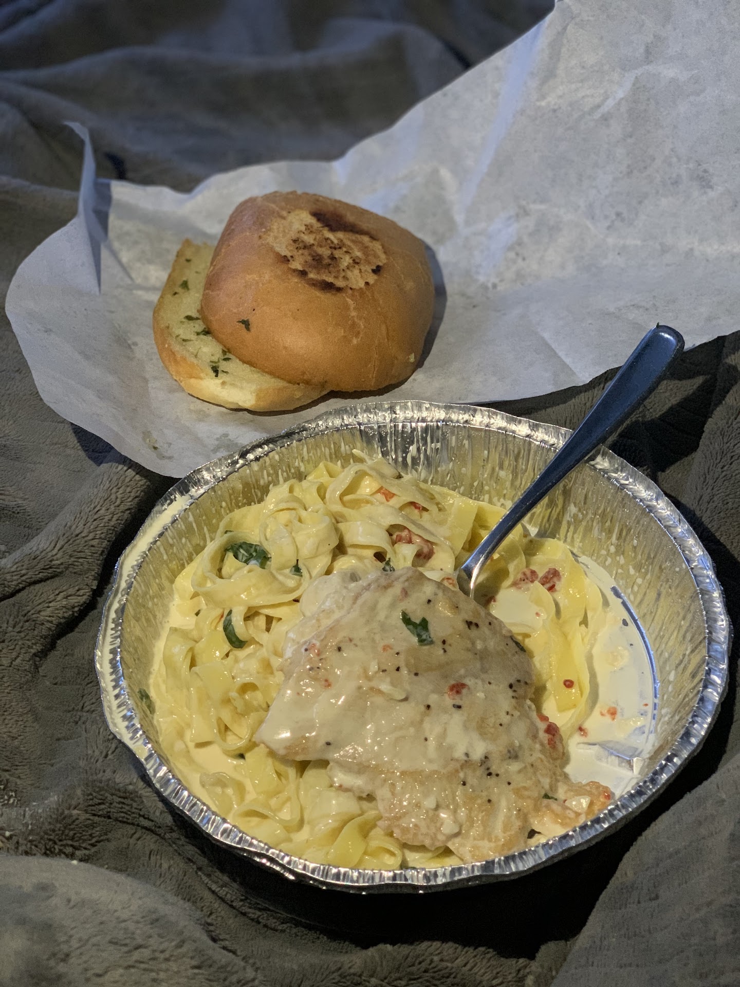 Was hungry and going to eat there but ate in the parking lot in our suv instead. We were waiting on my daughter and had to go to Stater Bros after so needed to eat before. Food was ok, dinner portions were small and two slices of garlic bread that was heavy on oil/butter but not on taste. Pasta and sauce was hot but shrimp and chunks of mushrooms were lukewarm, as if added right before handing it off. I couldn’t tell which was off, the mushrooms or the shrimp, but I didn’t finish the mushrooms because they were huge chunks and not cooked. I wish i hadn’t ate the shrimp. A few hours later it hit me hard. It was so bad.
