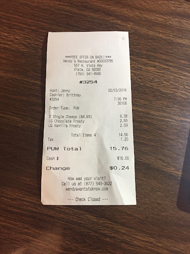 Read moreThis Wendy location happened when we found our usual Wendy closed. That other Wendy is on La Plaza Dr. Vista, CA. I like Wendy's restaurants because they have never disappointed us.