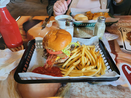 I ordered the cowboy burger it was a little dry and pretty light on the barbecue sauce I wouldn't have it again. The place it's self is like a mix between a hunters lodge and a casino. Our food took a while considering there was only 10 people in there and it's the first place where our waiting staff was up at the bar having food as well it was strange considering they handle your food. By far the worst is the parking lot or lack of one good luck finding a spot they have very...