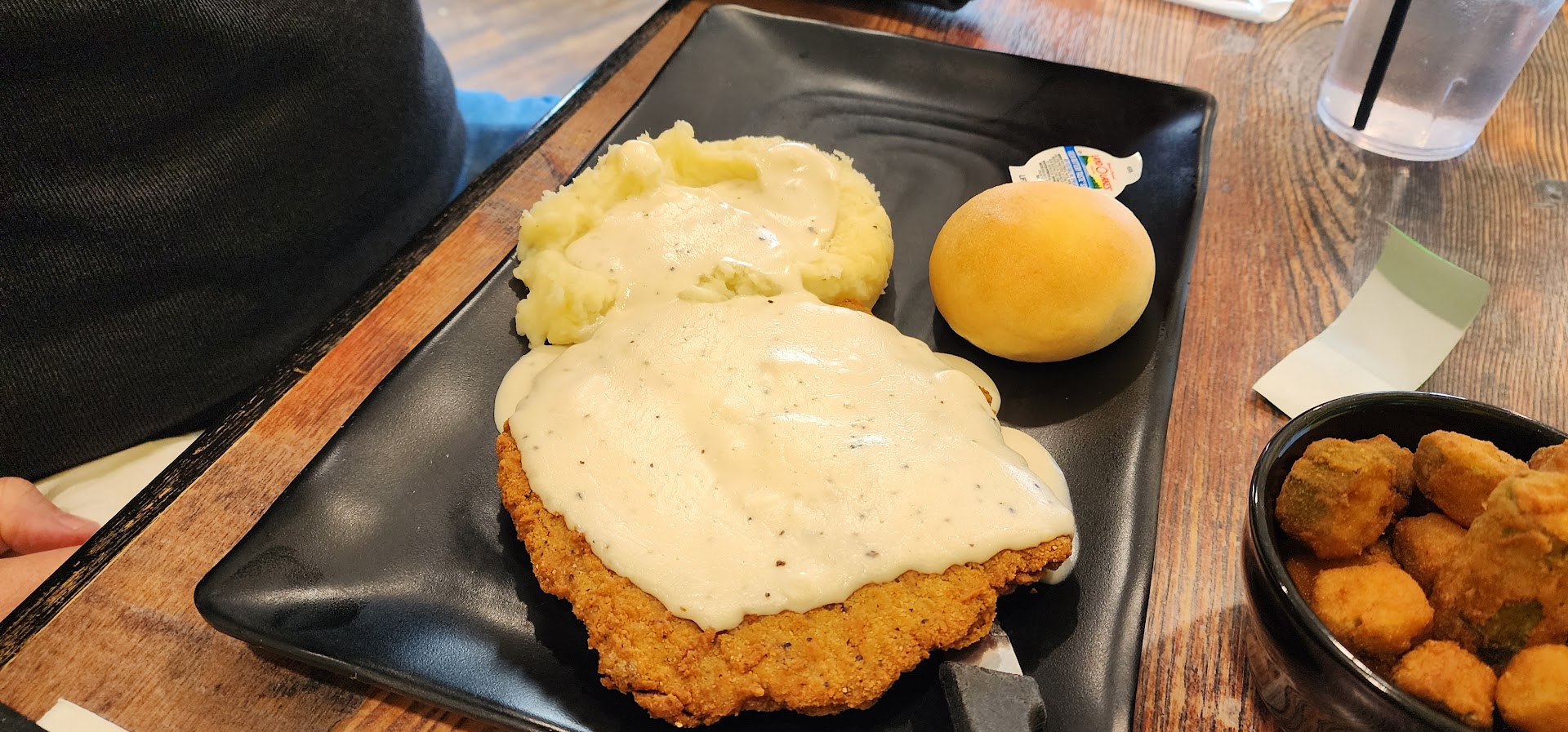 I liked the homemade meatloaf so much that I had it three times. It had finely minced onion and sweet peppers in it, and it is covered in caramelized sweet catsup-- my wife and I both loved it. We also loved the grilled pork chops with cinnamon apple slices. Both meals come with your choice of two sides, and they have a huge assortment of sides: including fried okra, turnip greans, beans (cooked with bacon), corn, sweet/creamy coleslaw, pinto beans, and macaroni and cheese. The sides are served in large bowls (we tried all except the turnip greens. After 4pm a baked potato is also available as a side (stick with butter and sour cream-- we didn't feel the up charge to make it "loaded" was worth it, and the potato is huge enough you don't need bacon and chives, and cheese on it.