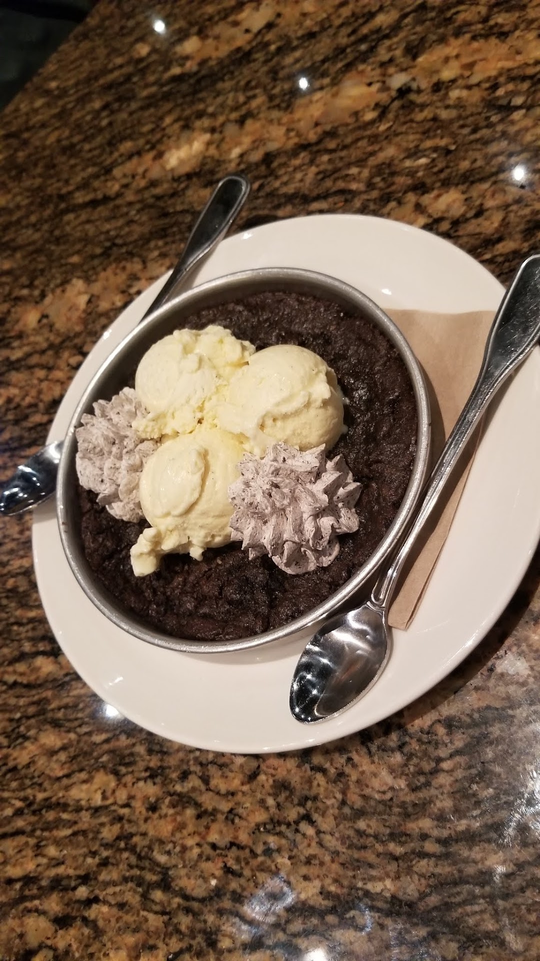 Since we were driving all day we split a simple chicken sandwich and finished with an oreo-whipped cream, ice cream, and chocolate "pookie". A real treat, fresh and hot from the oven in a small metal baking pan. It was almost a chocolate overload, but not quite. It was a delicious meal and sharing worked well for a traveling day.
