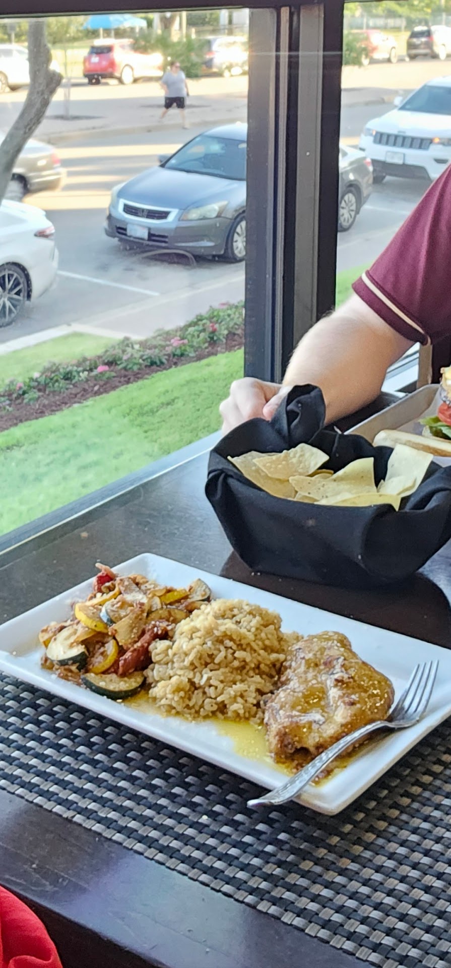Food: One of the chefs, Jay, greeted us and personally made all of our food. My wife had the rosemary chicken. It was amazing. Chicken perfectly moist, tender, and full of flavor. Rice, full of flavor. Basically what Im saying is he can cook. I was lazy and had a burger but he even brought that to life. Dont skip the waffle fries, they are the bomb. (Forgot to take a picture of food itself so cropped to show).