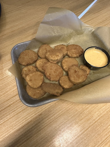 Once we said down it took the waitress awhile to greet us/ take our drink order. I watched her walk around and stand at the kiask for a bit before another waitress walked by her and they started talking. She finally came to take our drink and appetizer order. I will say, it was quick to get our drinks and our under cooked fried pickles but after that it took a little while for her to come back to get our order.