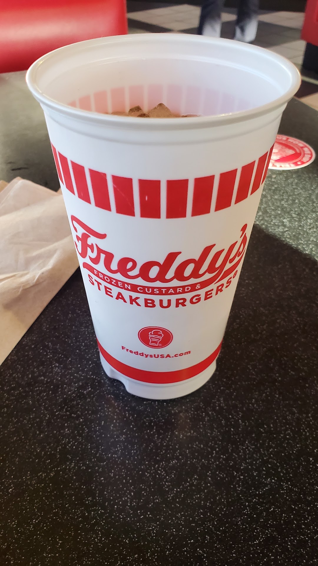 Read moreThis was my very first visit to Freddy's. Ive always wanted to go there but just never did. So I finally got a chance to visit and get some dinner for the family. I wish I would have kept going. Not one person in this place was friendly or had any light. They were all dead and just going through the motions. From the cashier to the guy who gave me my order. So I said to myself maybe the food will be awesome!!! NOPE! It was not good, over cooked, fries were terrible and not fresh or mixed in with old fries. Now the drink. I asked for tops for my drinks and the girl at the counter said they didn't have tops. Not sure why she didn't tell me this when she gave me the cups? I could have decided to go with another size. Im thinking to myself, why serve a size cup that you don't have tops for? And no! Not everyone is dinning in. How ridiculous this looks? I had to hold the cups to keep them from spilling. Thank God I did have to slam on brakes or I would have really been in trouble. Im extremely disappointed at this first visit. Im positive I will...