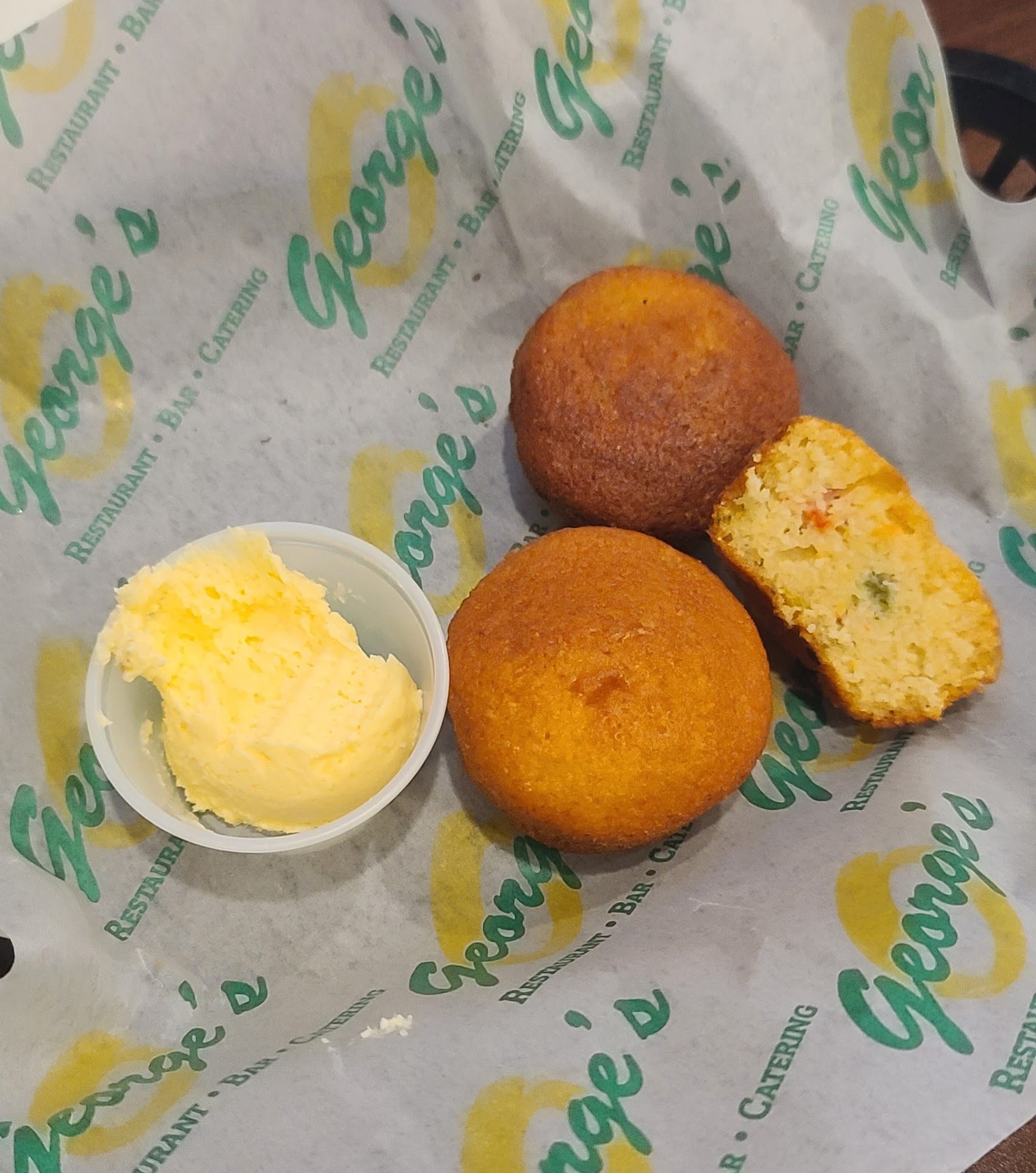 The crybaby burger. First, if you’re expecting that this burger will make you cry from being too hot, it won’t. What I mean is, there are jalapeños in it and pepper Jack cheese, but it isn’t spicy. It’s flavorful. I’ll start with the best part. The meat. Omg, the beef on this burger was so good. I could tell it was very good quality beef. It was served on a jalapeño bun, that had good taste and it was soft, but the texture was a little off. It was almost cake like instead of bread like. It was tasty though. I ate my burger with a knife and fork because the bread was falling apart due to texture. The question is, would I get this burger again? No. I’d try a different burger, and ask that the same beef patty that’s used in the crybaby burger be used. Oh btw, they served my burger without the onion rings, because they weren’t ready when my friends got their food so I got my hamburger first, and 30 minutes later, my onion rings came out. I shared them with my friends, and they loved them. They said it was the best onion rings they’ve ever had and that it was worth the wait. Imagine chicken fried steak batter on onion rings. That’s what they are. I prefer the traditional crispy breaded onion rings to the chicken fried steak batter onion rings. They tasted delicious but the texture was off for me. I do love the fries though. Those cheesy fries were so good, they had a sprinkle of chopped bacon on it. My favorite dish of the night for me that I will absolutely come back to George’s for are the crazy tails. Imagine jalapeño popper meets shrimp fritter sealing their love with bacon and deep fried crispy. Match made in culinary heaven. I can’t wait to go back and have more of those and try a cocktail. If you try a cocktail, make sure to have a designated driver, those cocktails look huge served in a fish bowl sized glass. I didn’t try one this time, but everyone around me seemed to enjoy them. Another thing, this place is great for a date night or for families with children that are older. Definitely not really a place for babies. More like a “moms night out” or “let’s go eat after the game” kinda place. Can’t wait to go back and I would recommend this place to my friends to try.