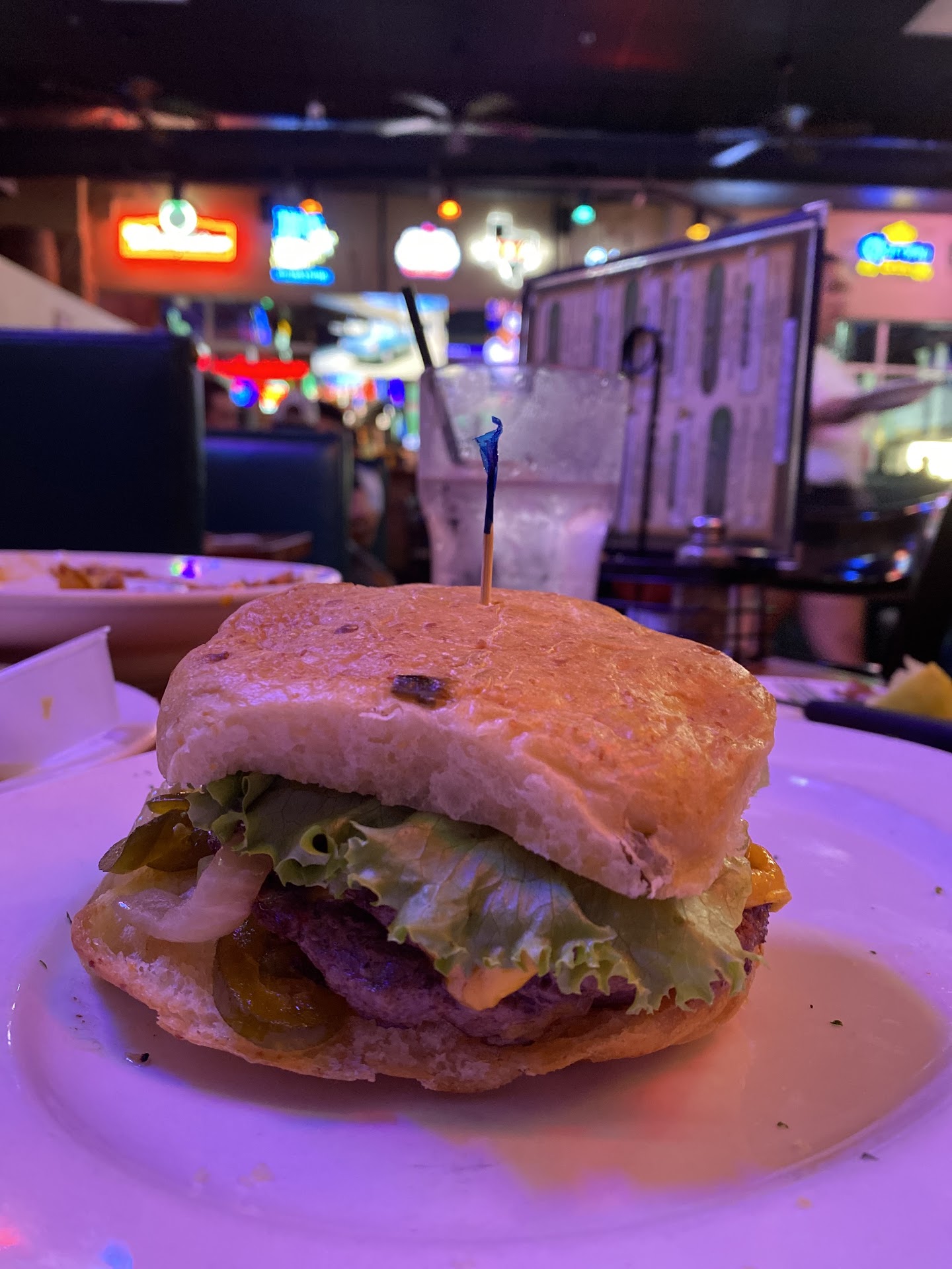 I ordered the crybaby burger with onion rings, and my friends ordered the cheesey fries with bacon, the crazy tails (bacon wrapped shrimp with jalapeños and pepper Jack cheese), nephew’s chicken with broccoli and sweet potato casserole, and the bruiser hamburger with fries. I can’t give a rating on what my friends had but I’ll tell you about mine.