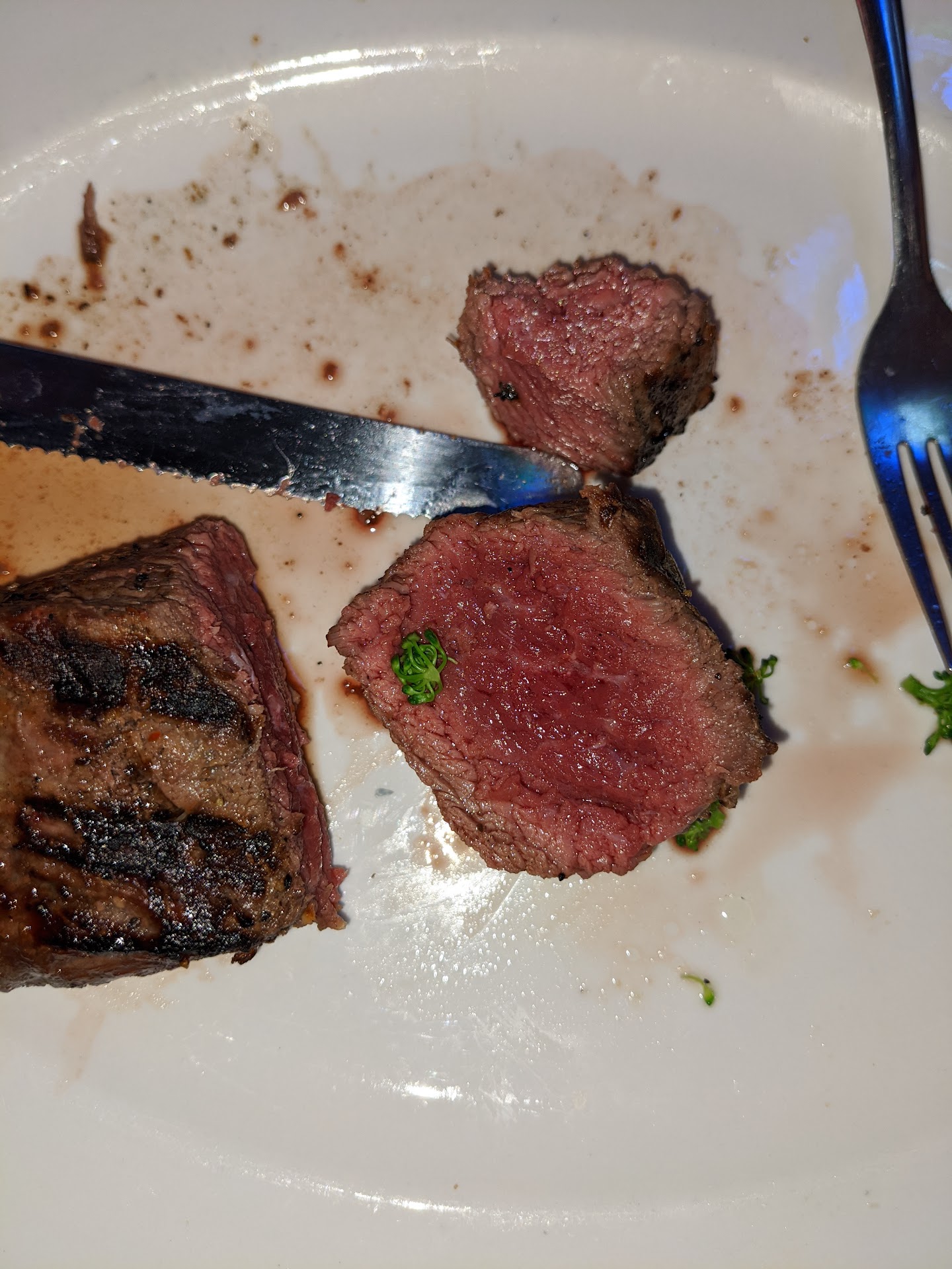 The entrees at #2 were nothing to write home about. The catfish was mediocre at best and the cook totally messed up my sirloin steak, not once, but twice. I ordered my steak medium rare. The first time it came out medium well to well done (hardly ANY pink). When I sent it back, one of the servers said the cooks weren't all that good at cooking steaks. And then, the second steak came out more rare than medium rare (see pic). I wasn't able to eat it as the center was barely warm and was very bloody. The server apologized again and offered to bring me something else to eat. By this time, the other person in my party was done eating, so I declined her offer.
