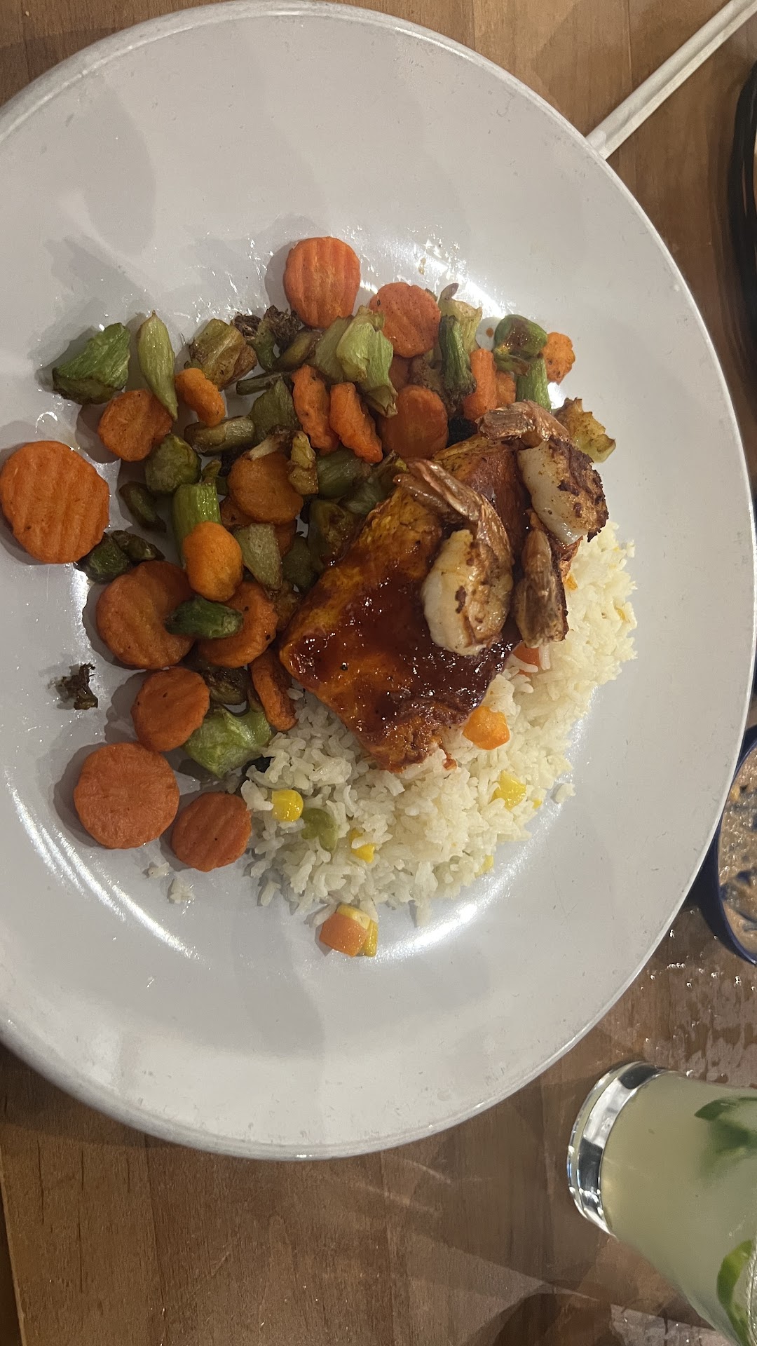 I ordered Emilio’s Salmon, a plate that sounds like a bold statement: adobo-glazed salmon topped with grilled shrimp, laid on a bed of rice with charred vegetables. It took about 25 minutes to arrive, which set expectations high — anticipation builds appetite. Unfortunately, the rice arrived cold, and the salmon was slightly overcooked. It started promising, with a bit of adobo heat on the crust, but quickly turned one-note as I worked through it. The grilled shrimp were small, and while nicely charred, they didn’t bring much to the plate beyond decoration. The vegetables were fine — just that. Not crisp, not juicy, just… okay.