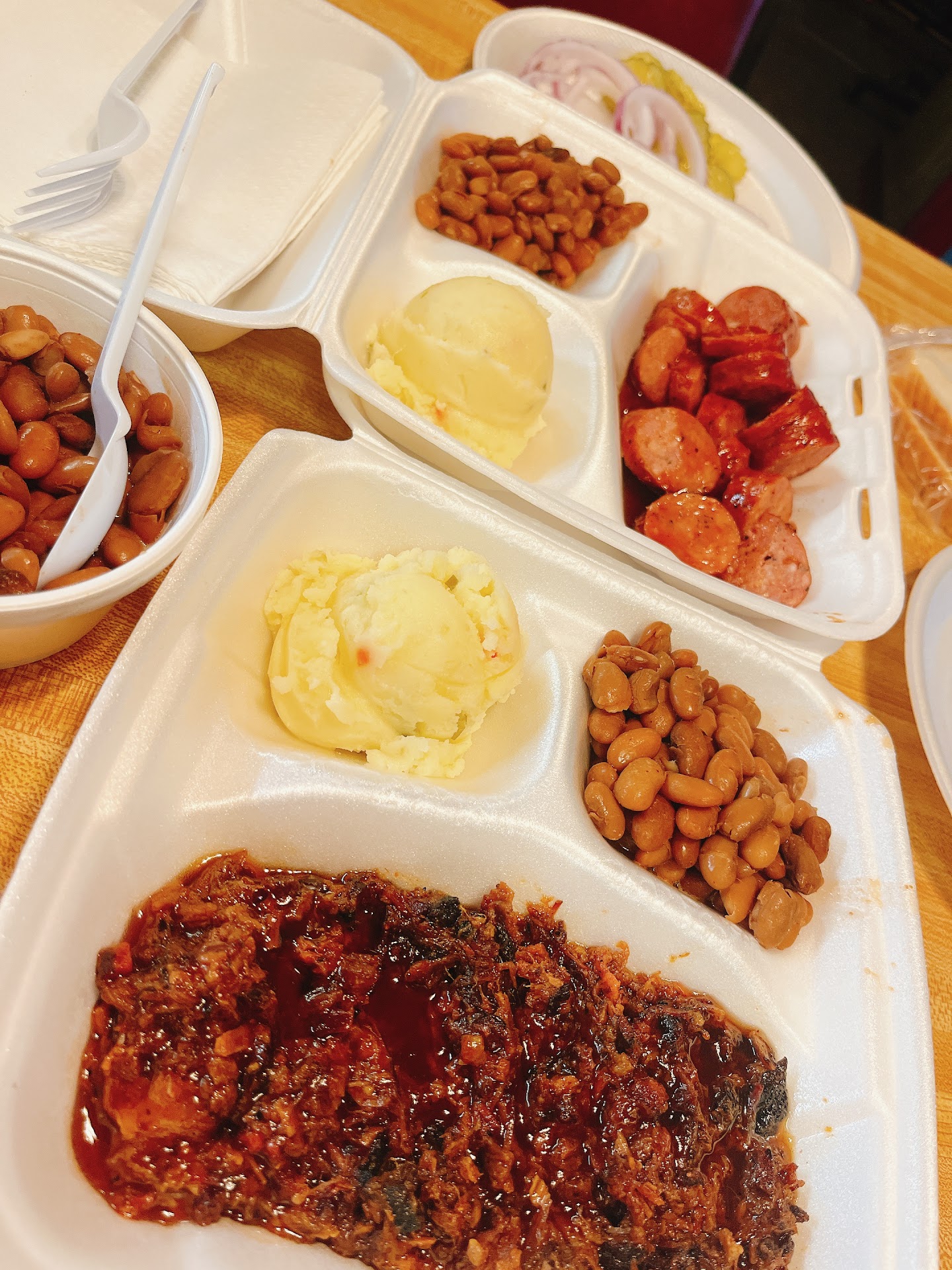 Read moreDecided to visit this place since we like exploring different BBQ. This place is very humble and cozy, the folks that run the place are extremely friendly and highly mannered. The prices are very inexpensive compared to other barbecue places probably because this is a locally owned mom-and-pop barbeque place. It is not fancy but has everything needed for a comfortable dining experience. The food itself was too sweet for my taste. The potato salad was sweet, the beans were sweet, and the BBQ was sweet. Their BBQ is definitely more from the Carolina's than Texas. I couldnt finish my meal because it was too much sweetness. Also, the brisket is oven baked. No smoke ring to be found. The ribs were...