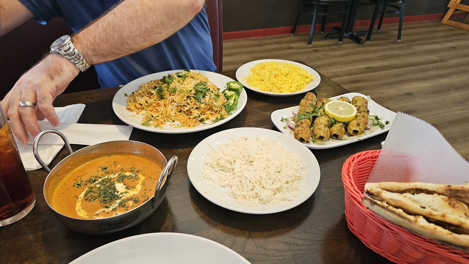 There were some good things, and there were some bad things. Idk if we'd return quickly to try again until the buffet part was open again, as my husband is not terribly fond of spicy food (we were told the buffet had been closed due to covid related drop in sales. Perfectly understandable) There are a lot of different things on the menu, but not quite the same level of variety as stone hearth. Some of the menu items are described the same, but are called different things, especially the curries. This made it a little confusing to order. The descriptions manage to pull off being both descriptive and very vague at the same time. They list some of the ingredients, but don't really leave an impression on how it will taste. There was no way to know which dishes were spicy and which weren't, so if you have low spice tolerance, ask your server for advice. My poor husband had it rough with his meal. Basmati rice is only included with the curry and (of course) the biryani/saffron rice combos. Any of the grill stuff you have to order rice separately. You do have to purchase the Naan separately, though it is pretty large for about $1.50. Naan was both soft on the inside and slightly crispy on the outside. We did get the chicken samosas, and the value is about the same as what you get at stone hearth. There are 6 small samosas to the order, in comparison to the 3 large samosas that stone hearth has. Both are quite tasty and are little pockets of intense flavor. I do prefer the paired sauces that stone hearth provides just a bit more, though. I had the karahi lamb, and whereas it wasn't bad, it didn't leave much of an impression, either. It looked rather oily(thankfully mostly absorbed by the rice), had a bit of a creamy texture, but all I could taste was tomatoes. It didn't have much flavor beyond that, and though it had jalapenos, it wasn't that spicy. The chicken leg and other grilled meat dishes had loads of flavor and spice, and I enjoyed the bits of those that I picked off my husband's plate. I just wish my curry packed as much of a punch. The only "bad" thing was that the orange chunks of chicken on my husband's grill platter had a strange propane(?) taste to it. I was apparently the only one who tasted that, and it wasn't all of the chicken that tasted of such. Some bites were flavorful spices, and some had that gross bitter taste that brought to mind the way propane smells. I'm not sure what it was, or why I was the only one that got the taste, but I was the only one to eat 2 pieces of it so idk if I was just having bad luck. The staff was fantastic, and both knew the menu well, and was able to clarify any questions we had. Our waitress was very attentive and checked on us often, despite there being quite a few other tables. I do appreciate their help and hard work. Overall a decent experience, good for those new to Indian food, and I am interested in seeing...