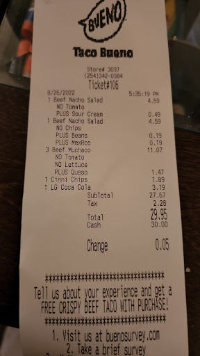Read moreThis Taco Bueno (the only location around this area) is making me sad frankly.- I've been eating from this establishment for about 30 year .(Since childhood). Its pretty much always been a decent fast food tex mex option. I know that over the years it's normal for prices and food and menu to change slightly. Especially in these times with the "fakeflation" going on ,oh I mean inflation going on.- However it's now costing us roughly 28$ for two adults and a toddler to eat this fast food tex mex.While the taste is still satisfying for tex mex,it seems the prices continue to go up and the serving sizes get smaller .Mucho nachos I've gotten for a straight 26 years .Never anything different.They have gotten so small lately and once again our last visit I've had to ask them to put meat on my nachos because you couldn't actually see ANY meat on them when I got them .They are getting so stingy with the beef. At these prices you should be able to see and taste meat on a menu item that contains meat .I really hope for better management and some changes at this establishment. Make it MORE BUENO again! The world of 2022 needs a 2004 BUENO...