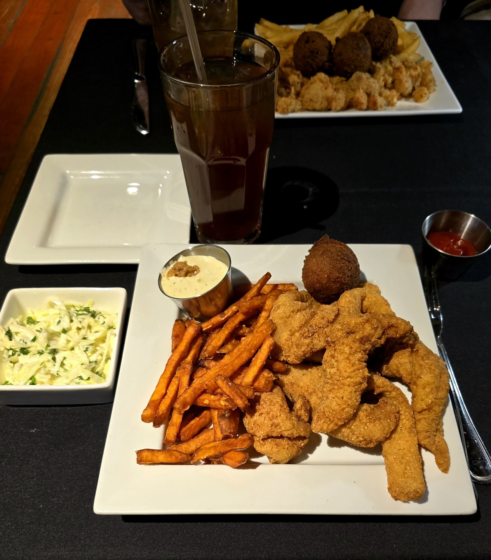 I ordered the plain Catfish plate with sweet potato fries substituted for regular fries. My wife had a fried combination plate. My catfish was very good, and everyone else enjoyed their selections as well. I had intended to order dessert, but our waitress never asked if anyone would like one. My friend offered to waive her down, but I decided to skip it since it was approaching 8:30 p.m. Our two main plates, a tea, and three cocktails resulted in a pre-tip tab of $91.98.