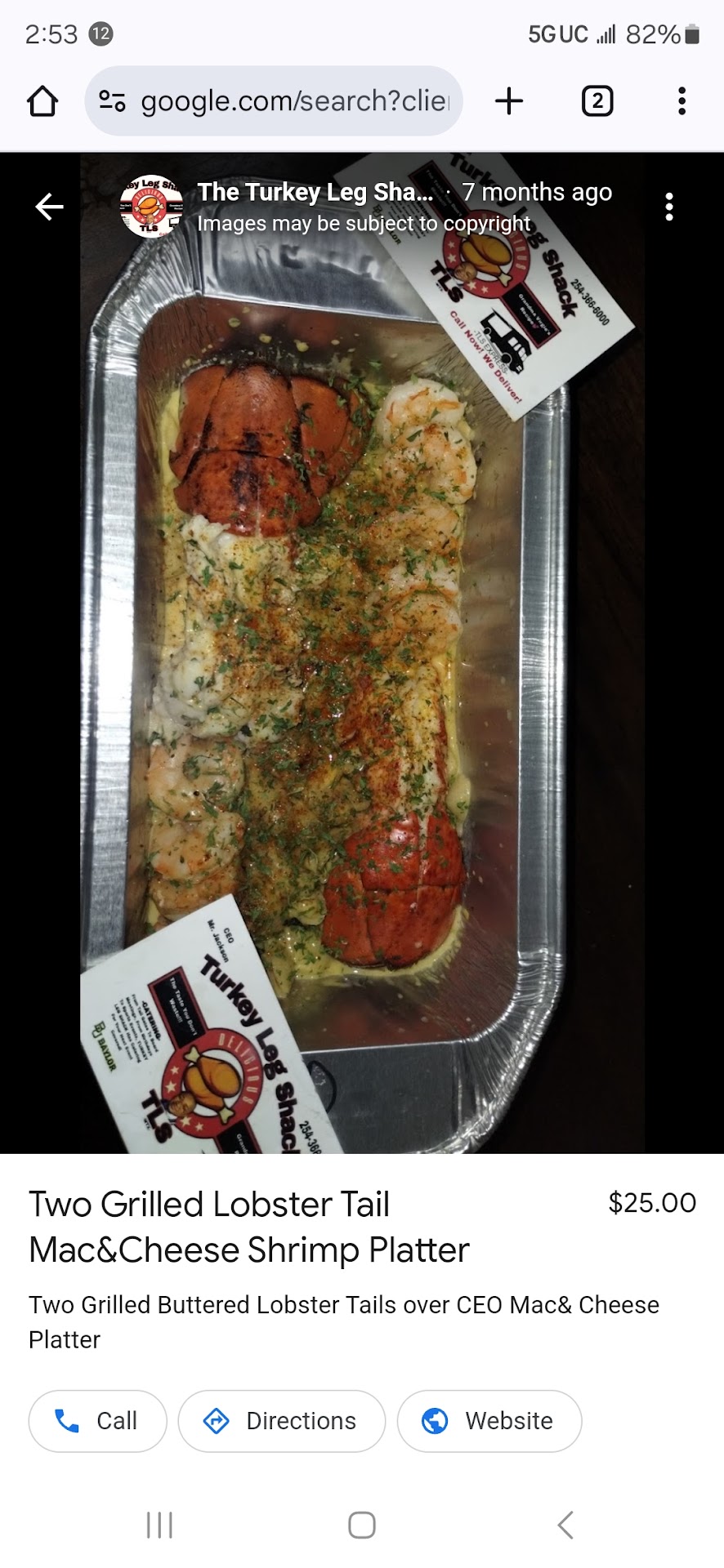 We ordered two grilled lobster, with shrimp and mac and cheese platters for Thanksgiving advertised as $25/ platter on Google in order to feed 3 people. When I placed my order, I was told it was $30 per platter plus a $14.99 Holiday Surcharge. I indicated these charges are not what is advertised on Goodle and there ws no active website. When placing my order they did eventually agree to remove the uncharge.