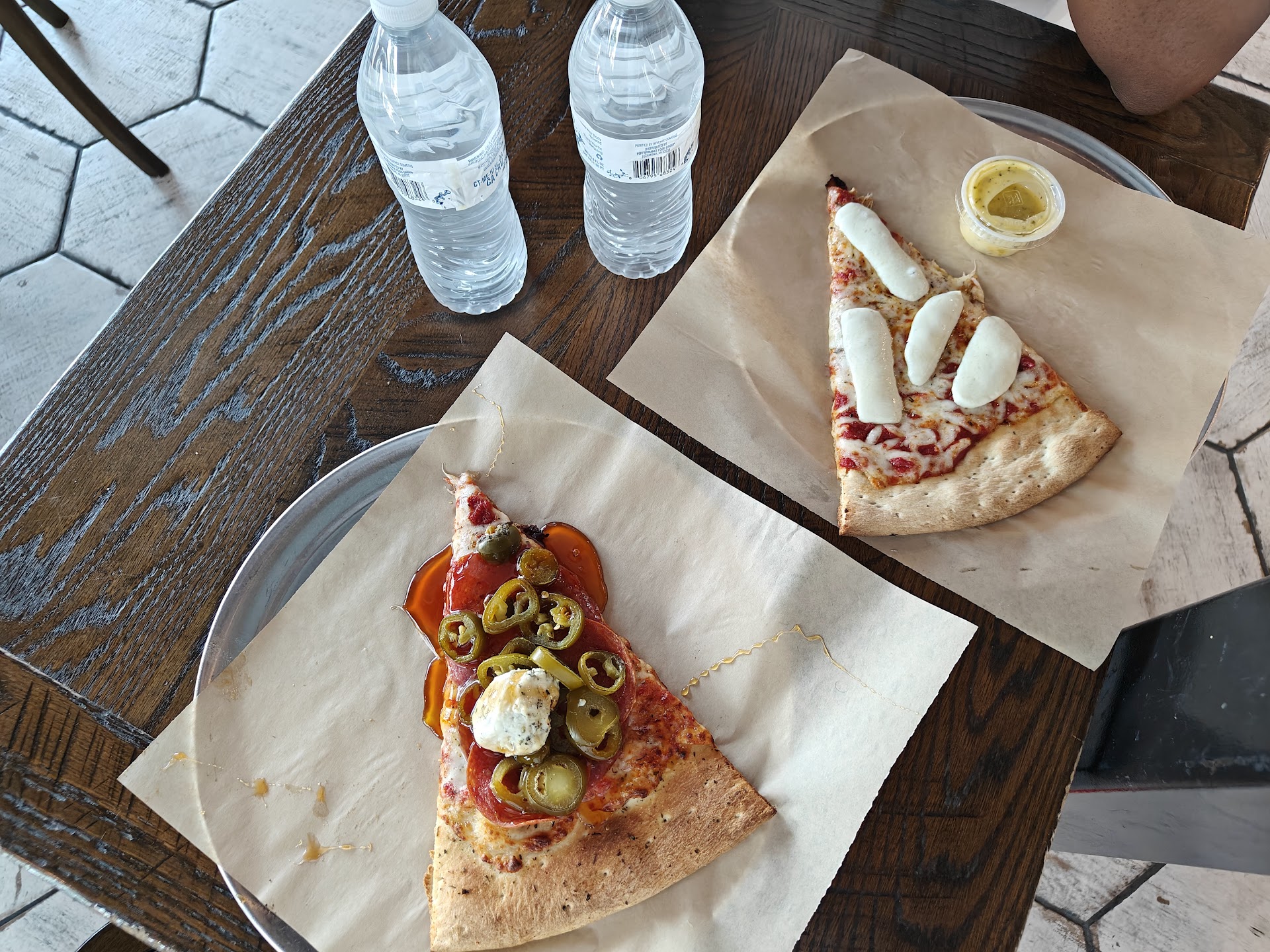 Lots of options but settled on this place. I was not disappointed. They were really busy but the young lady taking orders was a gem. We ordered the giant slices, meatballs and the ginger brew. Everything was delicious. The hot honey was my favorite. If you like a little spice pared with a bit of sweetness this is for you. The flying pig was my cousins choice. I liked it but pulled the pineapple off. The meatballs are ample and very tasty. The ginger brew has a hint of spice and is amazing. We ate there and it was a nice little atmosphere. My rating of 4 is due to the food pickup process. They take your number but it's not to page or call. It's placed on the tray. I had a lady pick up some of my order because she ordered the same slice of pizza. I pointed at my phone number and she was trying to tell me she ordered hot honey. I wish they would just use an order number. Also I ordered the 4 meatballs but was initially given 3. They corrected it and handed me 4 hot meatballs. I get it. They were busy. It's logistics and can be easily tweaked. But definitely the difference in a 3-4 or 5 rating. However it would not deter me from returning for more hot honey if I...