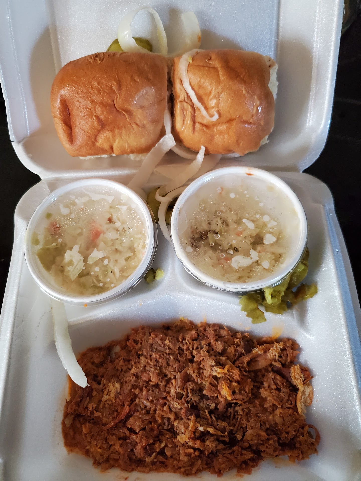 Hey ya'll, I had a chance to go through their drive through the other day. I haven't been there in a while. Things have changed! What I wanted was 2 chopped BBQ sandwiches. But what I got was food good enough for my dogs. I got two plates exactly the same on both. When I placed my order I saw a sign that said white potato salad or something other kind of potato salad. Well, I chose the white potato salad. In WHAT TEXAS UNIVERSE is their version of potato salad, the Texas way of white potato salad. Theirs looked like a cow done been chewing on it for awhile and then spit it back out into that cup. Enough of that. You want to talk dinner rolls, I got 4 of them. 2 on each plate. Now, I know ya'll can't tell but them rolls where some rolls that Ellie Mae made! Hard as a rock!!!!! Really could not eat them. Let's go on from here and get to the star of the show..... the BBQ!! Texas Best! I saw another sign,they had signs every where. I was to busy looking at the signs and trying to obey what the BBQ GOD had spoken through a sign. Man, don't want to piss them off! I saw another sign that read great deal 2 BBQ plates plus 2sides for $9.99. So, I did me some chewing and decided that was a pretty good deal. Let's put a pin in this.... if a farmer selling you that old horse and he keeps on showing you the back end of that horse. Well, chances are there is something wrong with the front end of that horse. And I feel that's just what was going on. When I got home and looked at that meat( they used the word "Blended" meat) and I asked what that that was. And the white hair man told that it meant that the BBQ meat was chopped up and BBQ sauce was added to the meat. Now,that don't sound so bad. He/ They Lied, they all did! To me it looked like the"blended" part was old pork left over from the past week, that hadn't sold. SO, they put a big sign on it and move it one step closer to the...