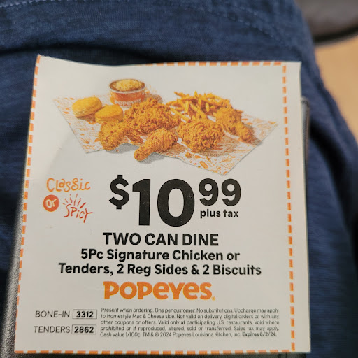 Everything that I ordered was fresh and delicious. Thank you, workers, for a pleasurable dining experience. Well, all the positive comments I said above are negated by the action of the general manager. Today, I went to get me my Popeyes order that I always get, which is blackened tenders with coleslaw and cajun rice. I normally spend like $15 or $16 on my meal alone. Today, I had a coupon for two can dine for $10.99, and I went to use the coupon, and the general manager says you can't get the blackened tenders with this coupon. Now, I'm not one to argue, but this manager has checked me out multiple times, and I have used this coupon multiple times. She, of course, didn't remember our encounter and denied that she has done this, but I have receipts, literally. Nowhere on the coupon does it say you can't get blackened tenders. It just says signature chicken or tenders, classic or spicy. When I was walking out, she said a comment about its just a coupon, sir, but she was condescending about the situation. Look, we can all agree that the price of food is astronomical, and minimal wage has not caught up to inflation. I'm trying to save Dat money anyway I can. I'm so disappointed in this Popeyes because it is always something with this store location. Last week, my coworker and I walked out because they had a line, and I witnessed a worker take a piece of chicken out of the big basket that they keep under the heat light and eat a bite because they mixed up the mild and spicy. Maybe I'm wrong, and I will own that fact. However, they should specify on the bottom of the coupon in the little...