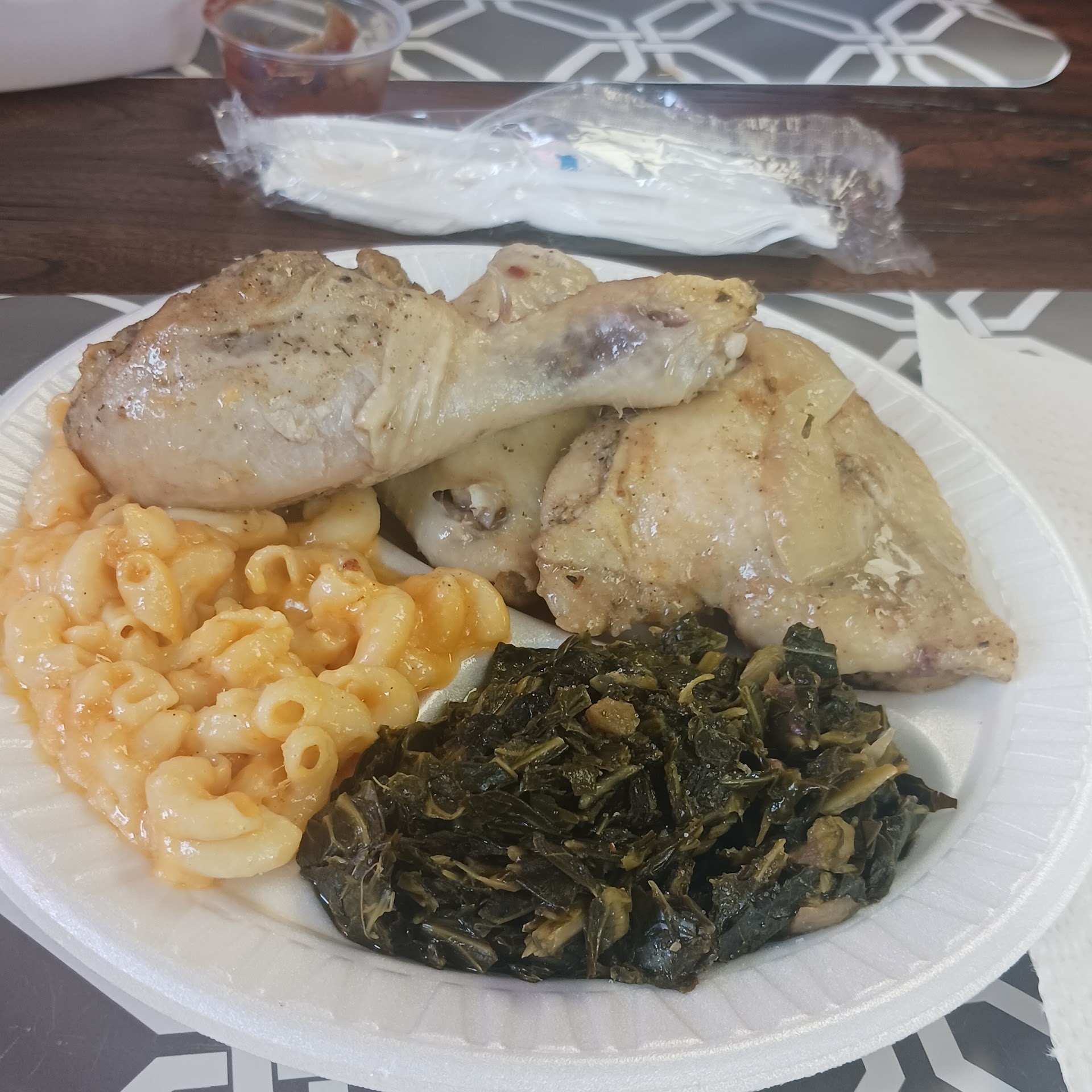 Place is awesome. Firstly, I loved the energy of the person who took my order, she was absolutely a delight. I got a barbecue plate with collards and fries, as well as a sweet tea. My barbecue was very good, not a typical Carolina style, as it was a bit sweet, but still very savory with a right amount of sauce. Not a whole lot to say about the fries, they were just your typical very good fries, but the collards were absolutely delicious, the best I've ever had. The sweet tea was also unique compared to other places, as it had a bit of a honey taste, and a prominent peach flavor. Normally I don't like sweet tea that differs from the typical flavor, but this was an exception. The poundcake I got was also very good. Will be back at some point to try the fried chicken, because this is a gem of...