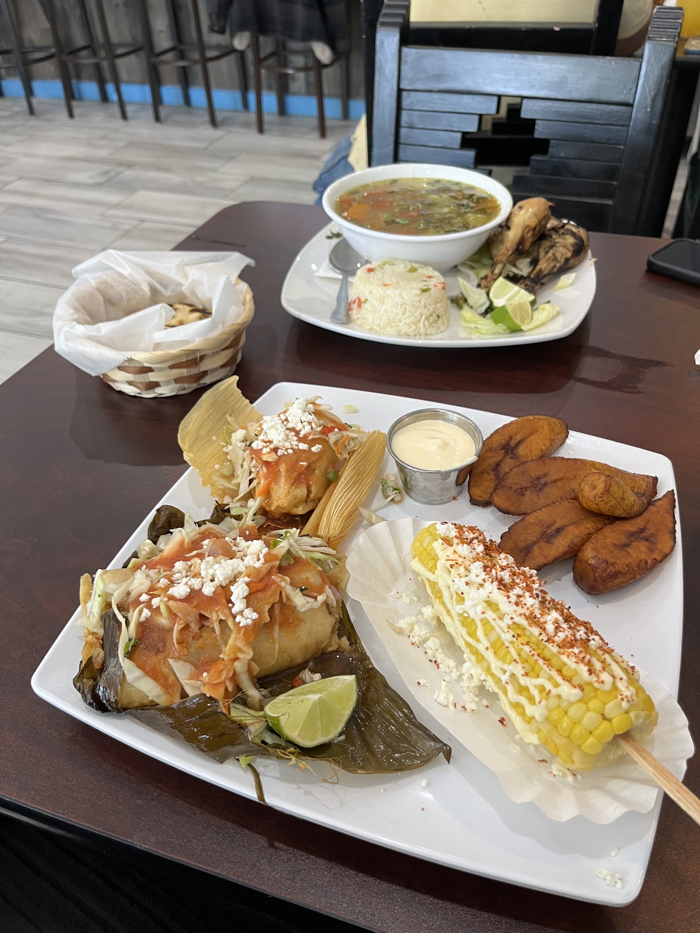 We ordered: Guatemalan style pork tamal wrapped in grape leaf. So tender and flavorful. It was loaded with toppings and perfection. Chicken Tamal: smaller than a regular size tamal (which the server told me) but loaded with flavor, sauce and toppings. So good. Maduros: (sweet plantains) Exactly what they should be, sweet and not over ripe. Comes with a crema dipping sauce. Elote (Street corn): Heaven. Mayo with tajin and perfectly cooked! Sopa: Caldo de pollo (chicken soup): huge bowl of veggie chicken soup with noodles. Comes with a side of rice, fresh hot tortillas, and grilled chicken. I added the rice and the chicken to the soup but you could eat it as is on the side.