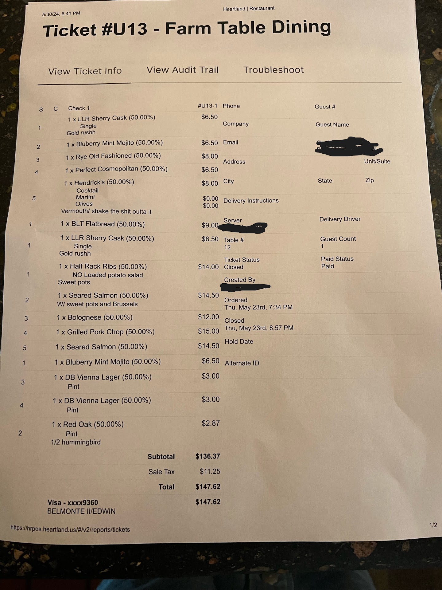 The bill for the 5 of us came out to $295.25 which was split 50/50 between myself and my father leaving two checks for $147.62 and 147.63 respectively. I was handed the check for $147.62 and paid with card, my father left $200 in cash in his receipt. Seeing as the service had been not so stellar we elected to leave the change from his cash as a tip and I signed my receipt with "cash" written on the tip line and the total on my receipt being $147.62. We then left. Fast forward a few days while looking through my bank statement I discovered that I had been charged for both amounts. Obviously I figured this was in error and that there had been some mistake and being a business owner myself I know that things happen and humans are human so I decided to give them the opportunity to make it right. So I drove out to Farm Table yesterday 5/30 and asked to speak to a manager and was introduced to a gentleman named Todd. After explaining what happened and even showing him a bank statement reflecting the charges he seemed dismissive and unbelieving. He asked me to email him the statement and that he would look into it. I then went home. Upon checking my email this morning I was greeted with exactly what I expected to see; Flat out denial. He attached pictures of an audit sheet showing what we had and how it was charged and told me to take it up with my bank.